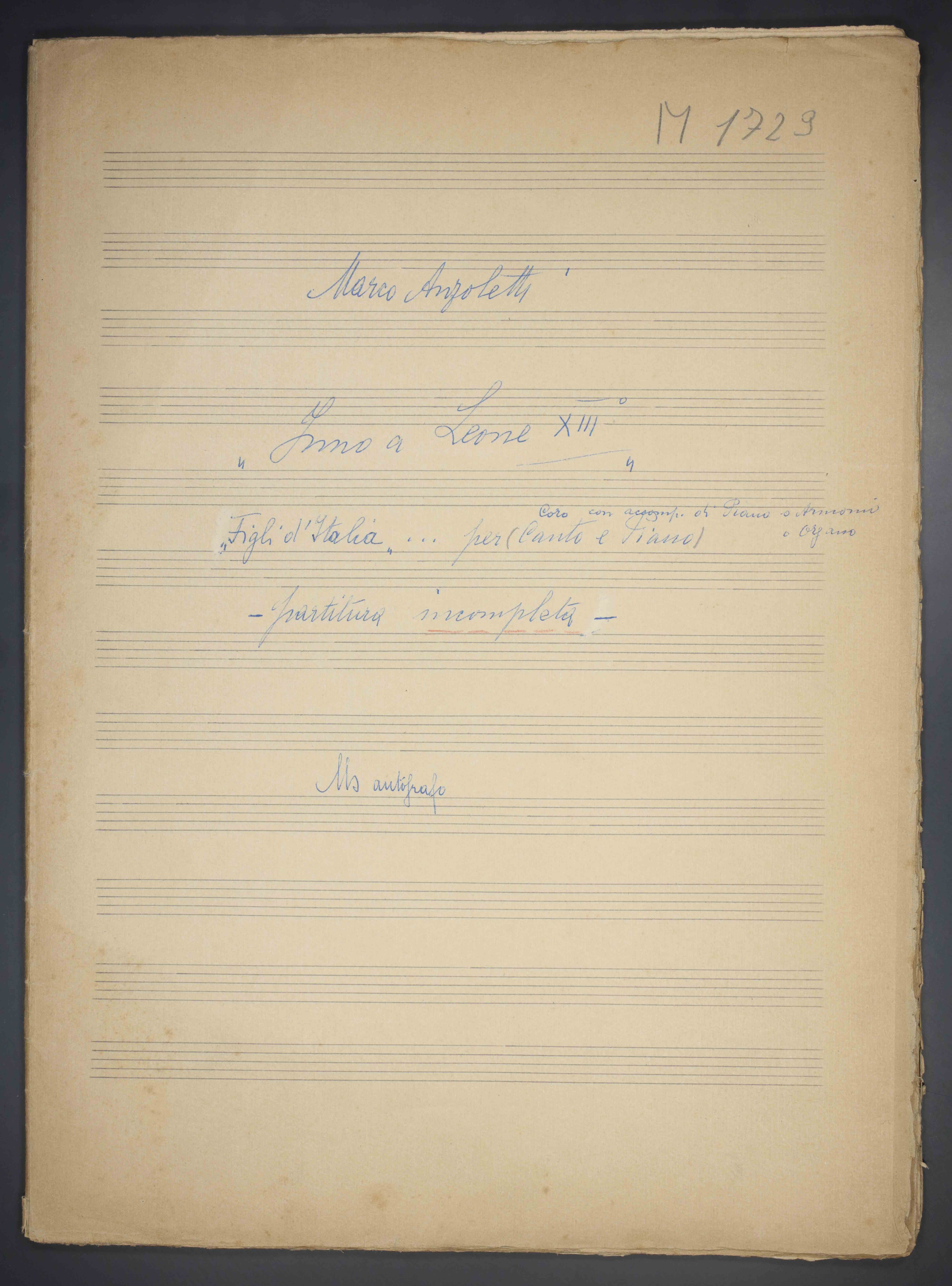 1 partitura ([2], 37, [1] p.) , 33 cm. Ricevuto in deposito dalla Società Filarmonica di Trento nel 1941. Manoscritto autografo. Partitura autografa incompleta, per coro e armonium (o pianoforte o organo) conduttore. In molte pagine battute vuote. Testo di Luisa Anzoletti