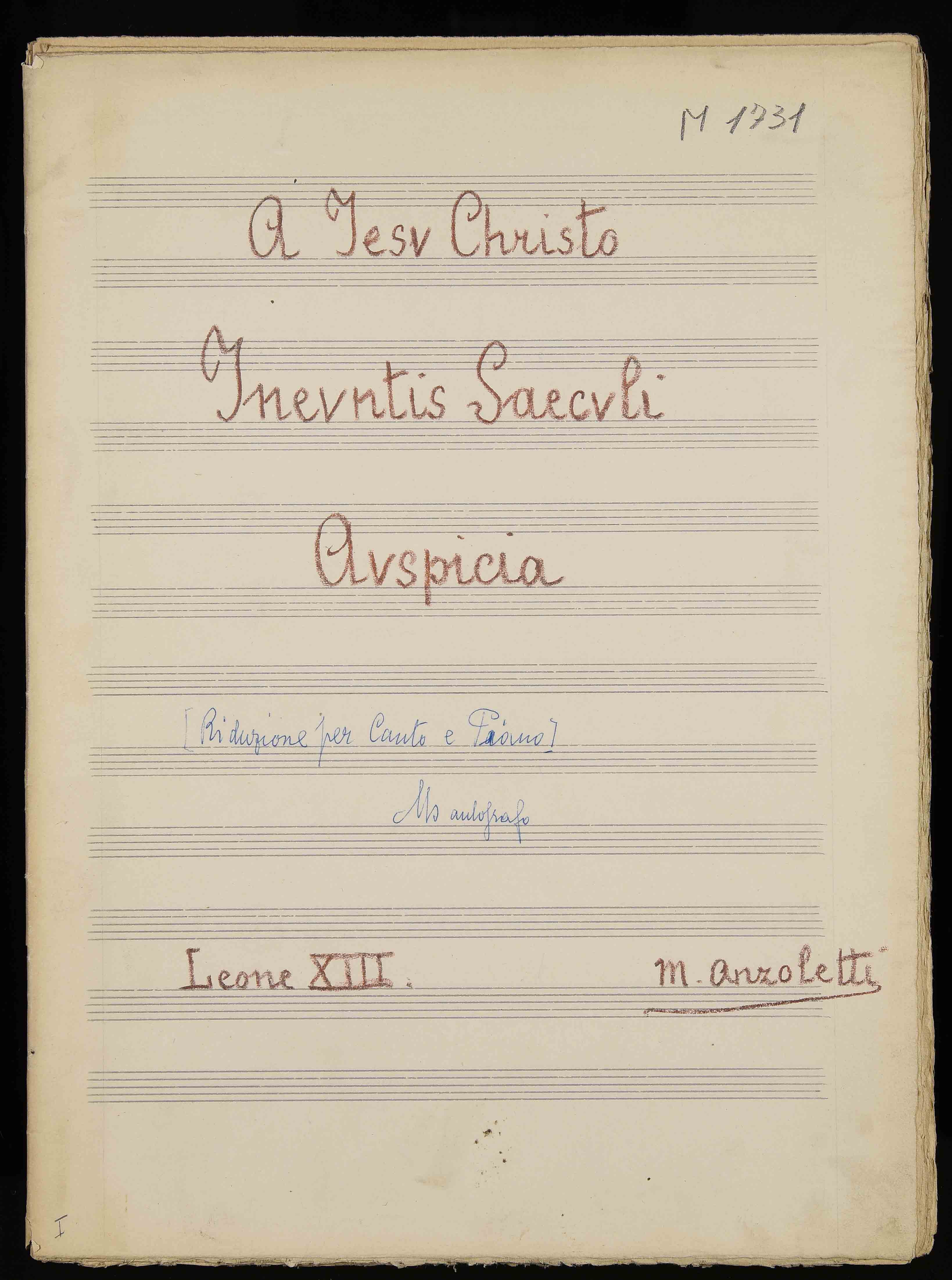 1 spartito ([4], 37, [3] p.) , 33 cm. Ricevuto in deposito dalla Società Filarmonica di Trento nel 1941. Manoscritto autografo. Dedica a Papa Leone XIII