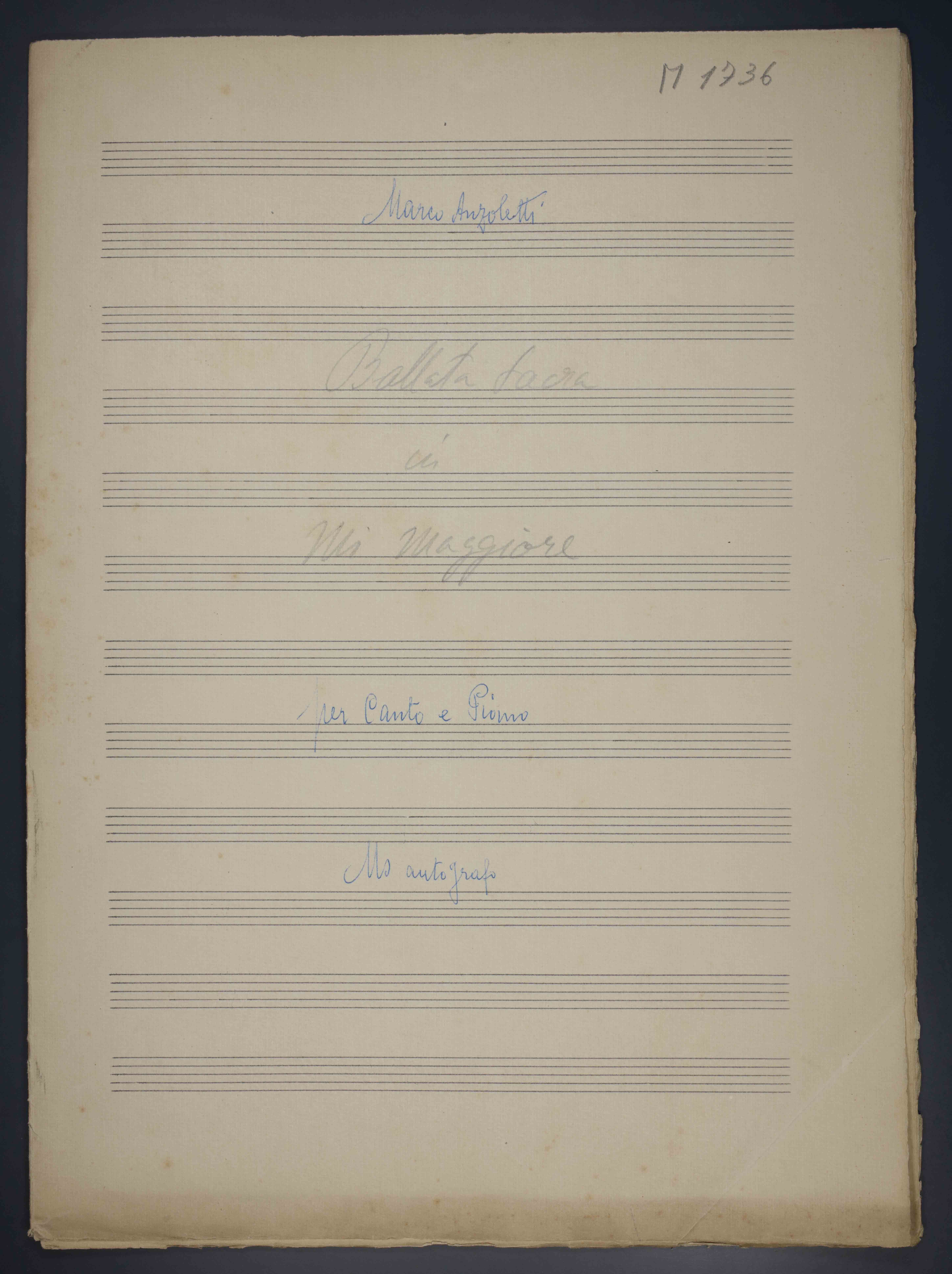 1 partitura ([2], 5, [2] p.) , 33 cm + 4 p. di testo. Ricevuto in deposito dalla Società Filarmonica di Trento nel 1941. Manoscritto autografo