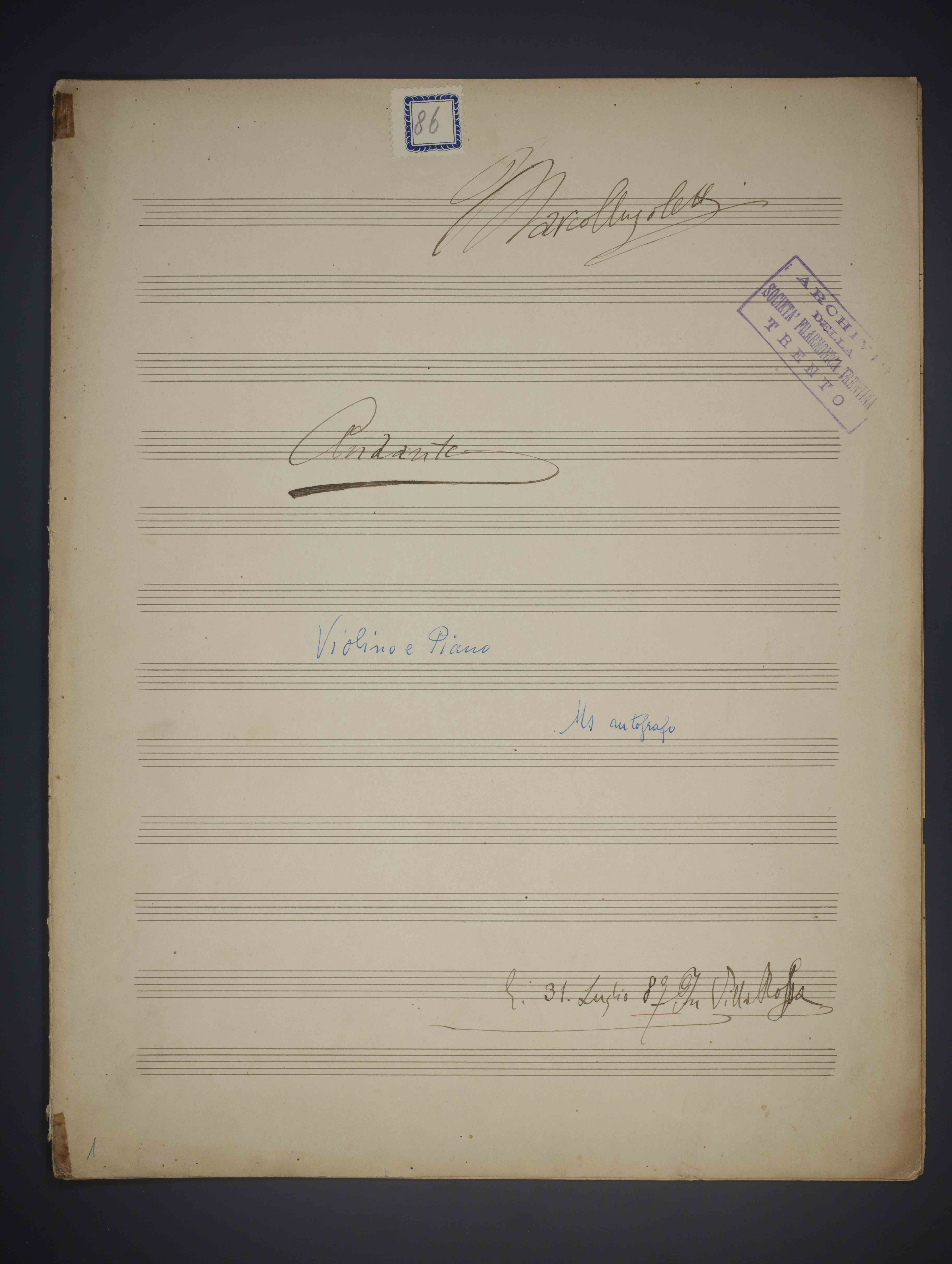 1 partitura ([8] c.) , 34 cm. Ricevuto in deposito dalla Società Filarmonica di Trento nel 1941. Manoscritto autografo. Antica segnatura di collocazione a c. 1r: 86. Timbri dell'Archivio della Società Filarmonica Trentina, Trento a c. 1r e c. 2r