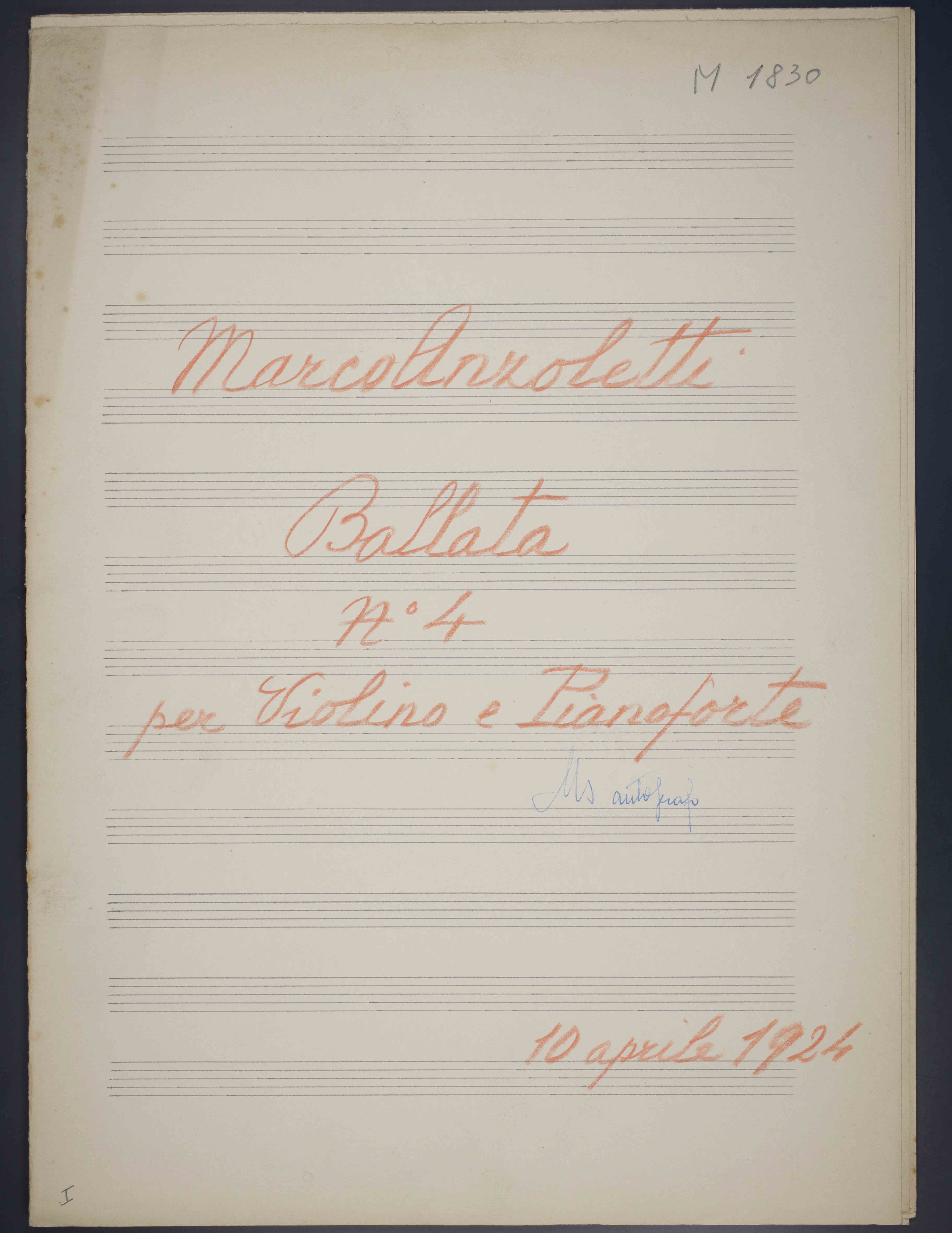 1 partitura ([2], 12, [2] p.) , 34 cm. Ricevuto in deposito dalla Società Filarmonica di Trento nel 1941. Manoscritto autografo