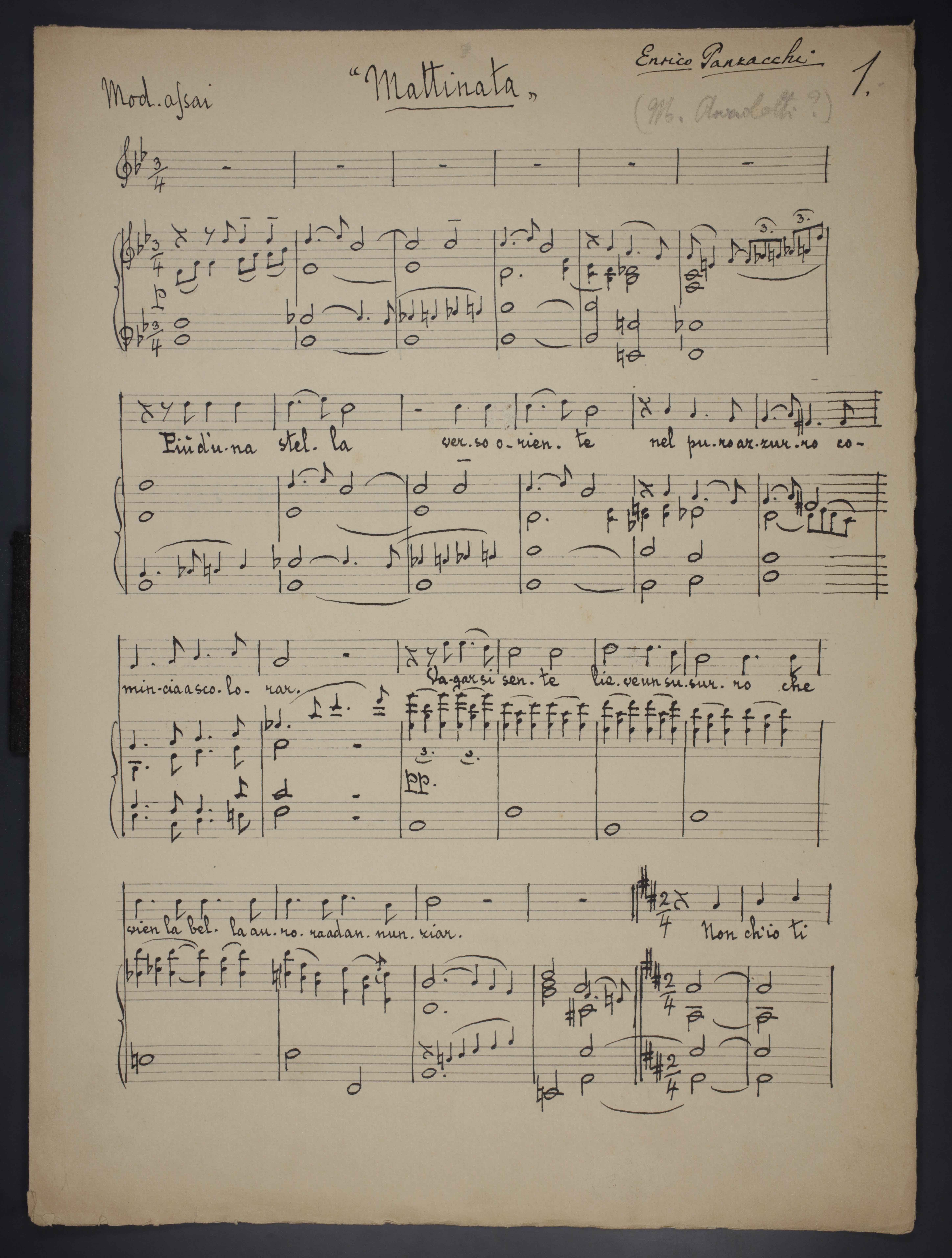 [2] c. , 33 cm. Ricevuto in deposito dalla Società Filarmonica di Trento nel 1941. Manoscritto autografo. Testo di Enrico Panzacchi