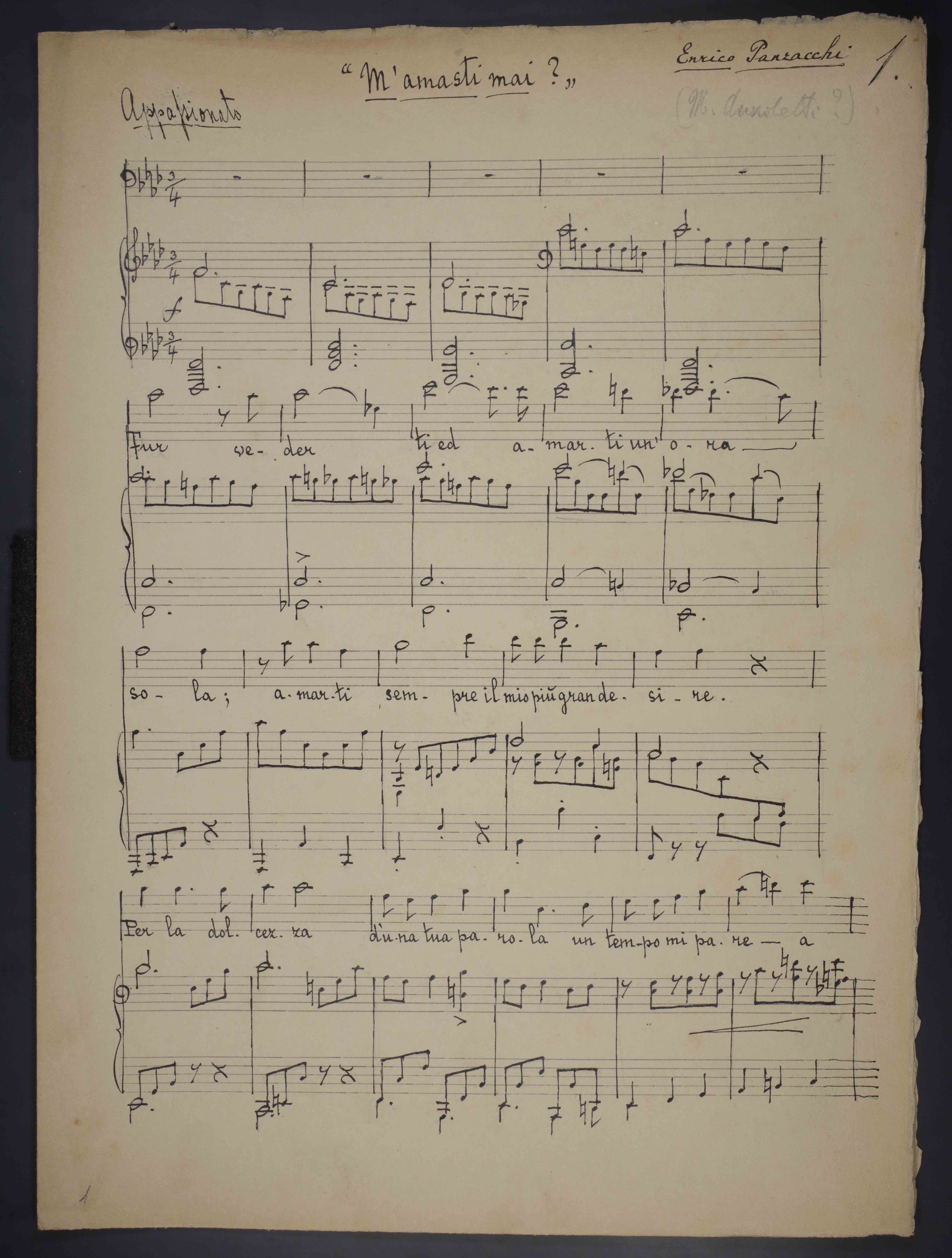 3, [1] p. , 33 cm. Ricevuto in deposito dalla Società Filarmonica di Trento nel 1941. Manoscritto autografo. Testo di Enrico Panzacchi