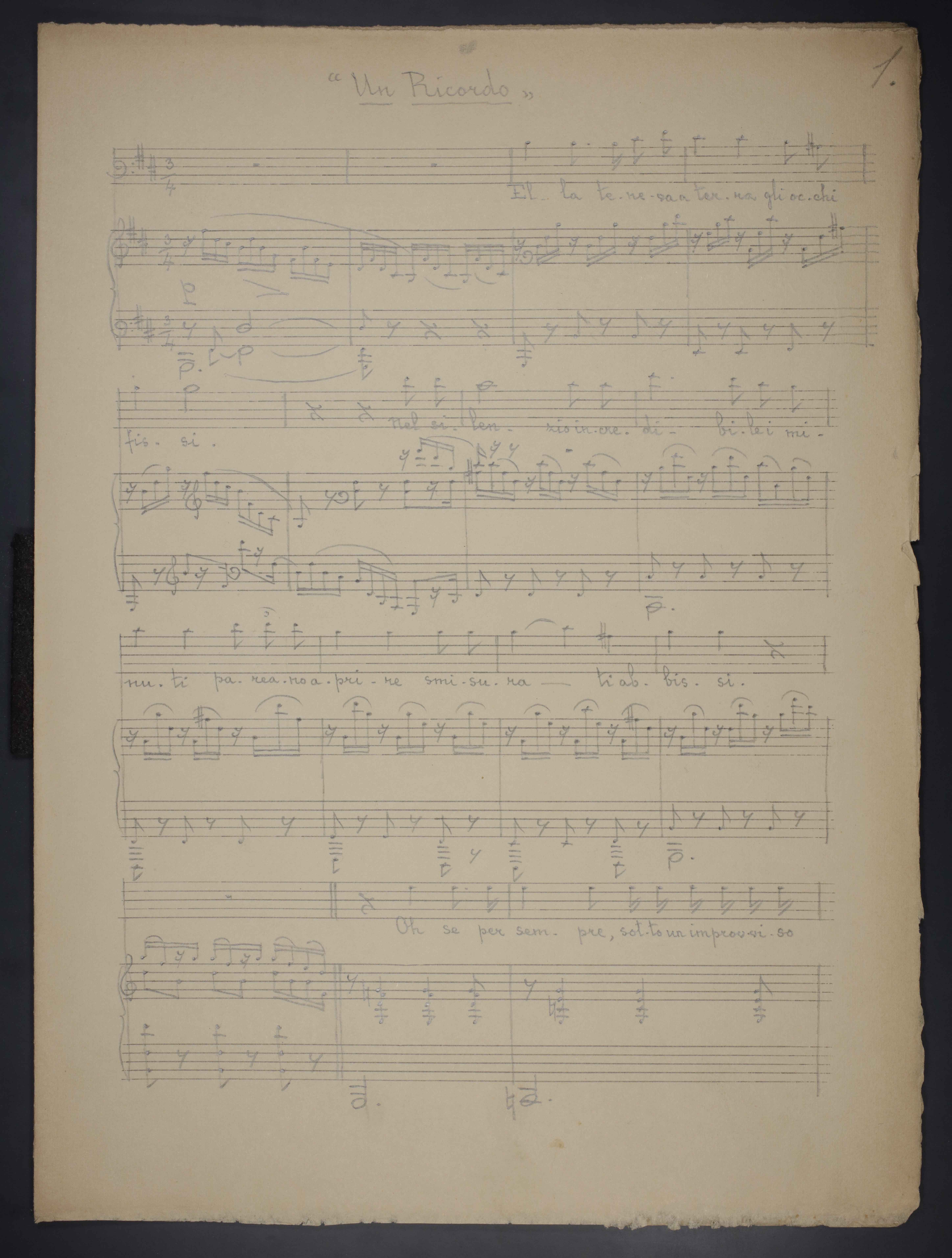 3, [1] p. , 33 cm. Ricevuto in deposito dalla Società Filarmonica di Trento nel 1941. Manoscritto autografo. Testo di Gabriele D’Annunzio.