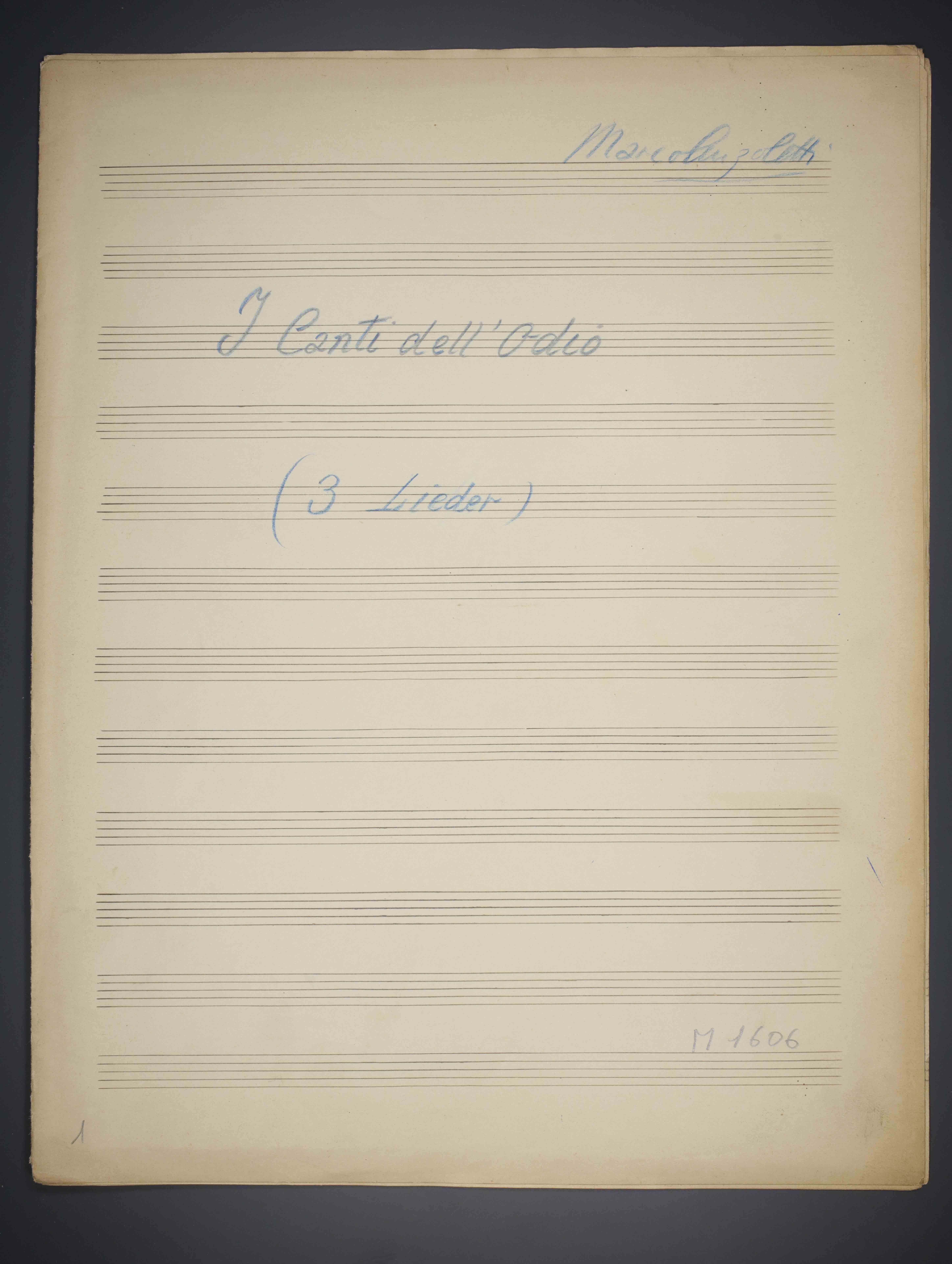 [8] c. , 33 cm. Ricevuto in deposito dalla Società Filarmonica di Trento nel 1941. Manoscritto autografo. Testo di Giovanni Prati. Contiene le canzoni Vendetta , Condannato a morte , Il delatore.