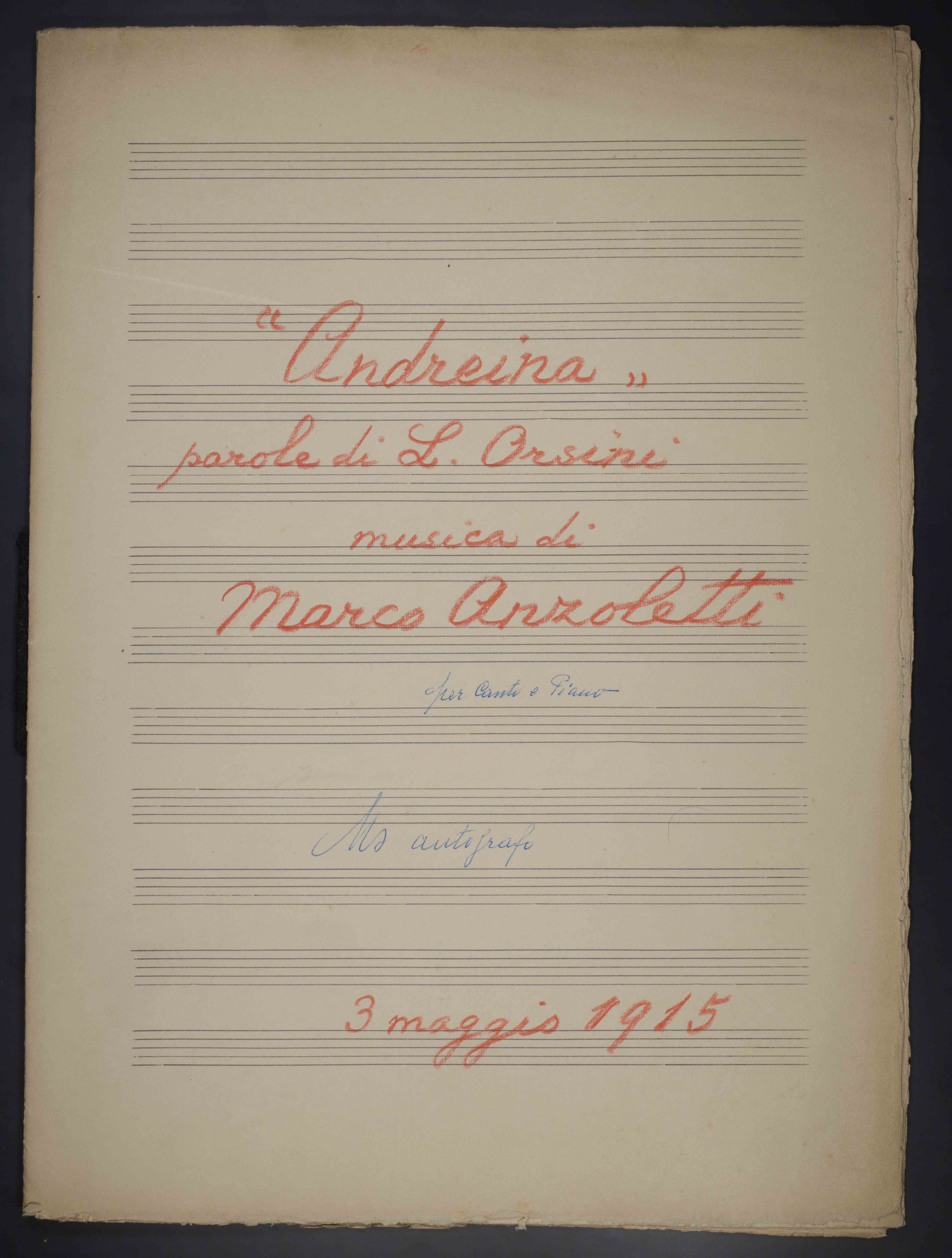 [2], 12, [2] p. , 33 cm. Ricevuto in deposito dalla Società Filarmonica di Trento nel 1941. Manoscritto autografo. Testo di Luigi Orsini