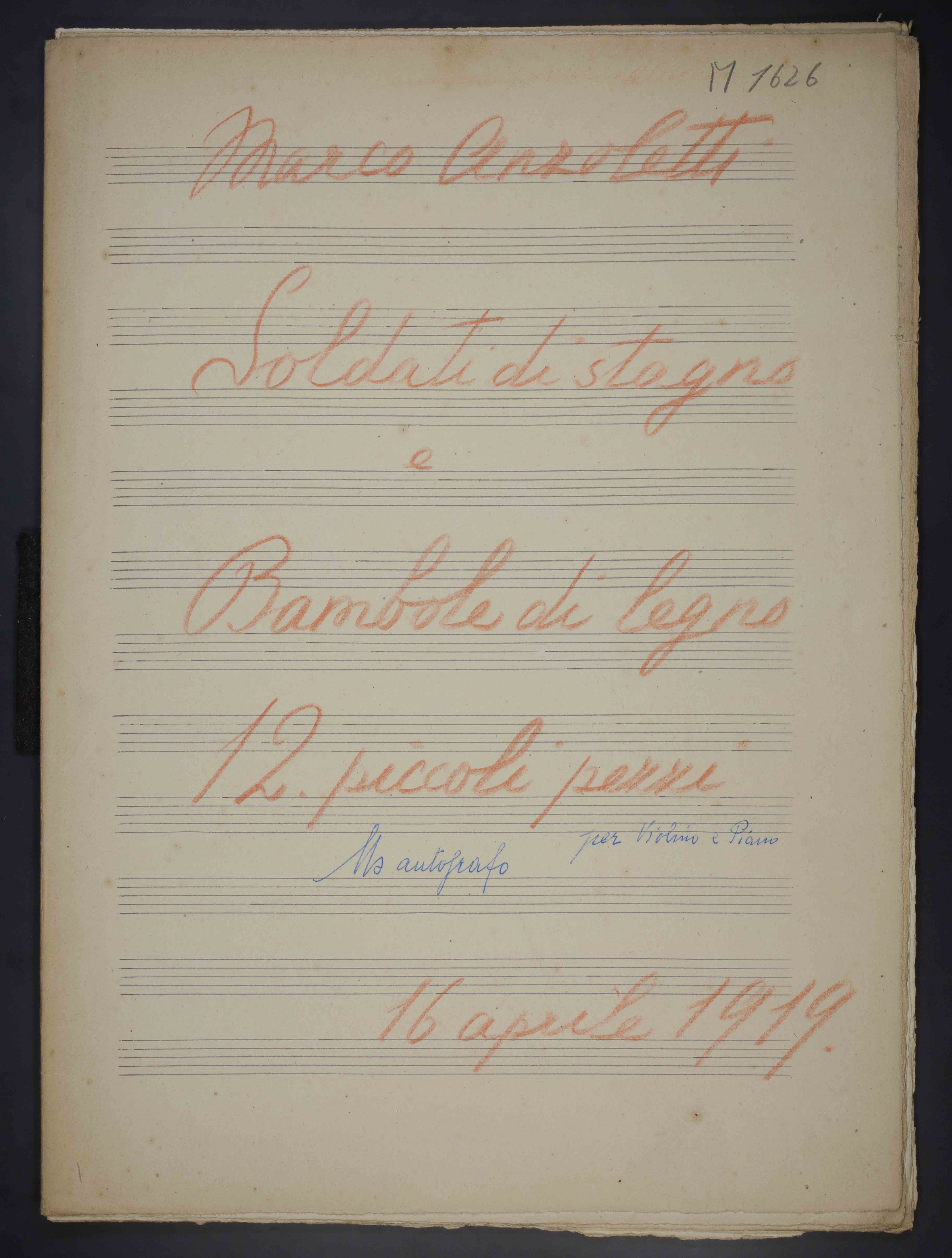 1 partitura ([20] c.) , 33 cm. Ricevuto in deposito dalla Società Filarmonica di Trento nel 1941. Manoscritto autografo. Contiene: 1) Il trionfo dell'eroe , 2) I passatempi e le malinconie d'un consegnato , 3) Bivacco (La legione ceco-slovacca) , 4) Fanfara (dei piccoli bersaglieri) , 5) Il ritorno al villaggio , 6) La sonatina del piccolo mutilato , 7) Il sogno della bambola , 8) Sorrisi e lacrime di bimba , 9) Il ritratto d'una bambola , 10) Dispettucci e carezze di bimba , 11) La preghiera della sorellina , 12) Piccola amazzone