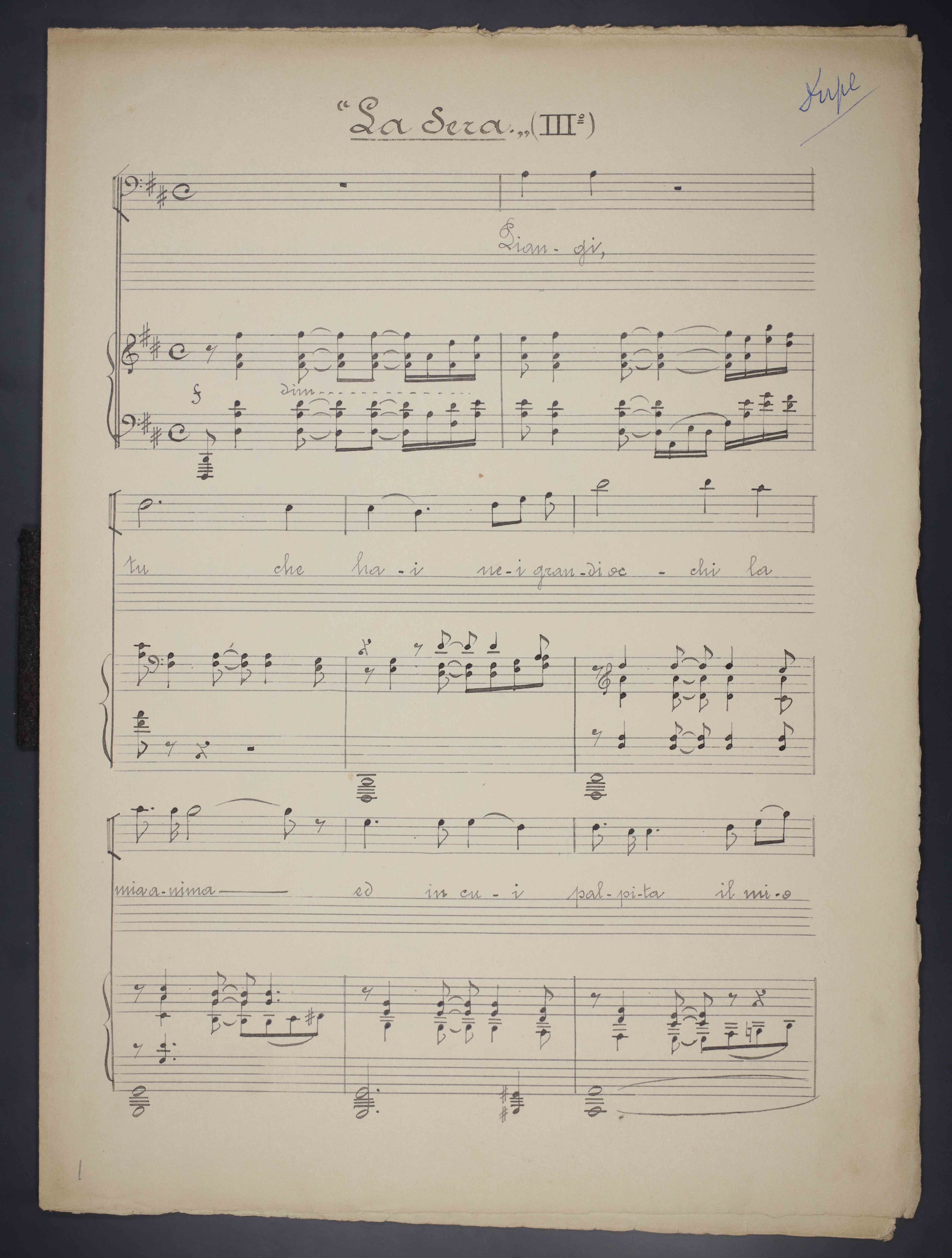 [2] c. , 33 cm. Ricevuto in deposito dalla Società Filarmonica di Trento nel 1941. Manoscritto autografo. Testo di Gabriele D’Annunzio.