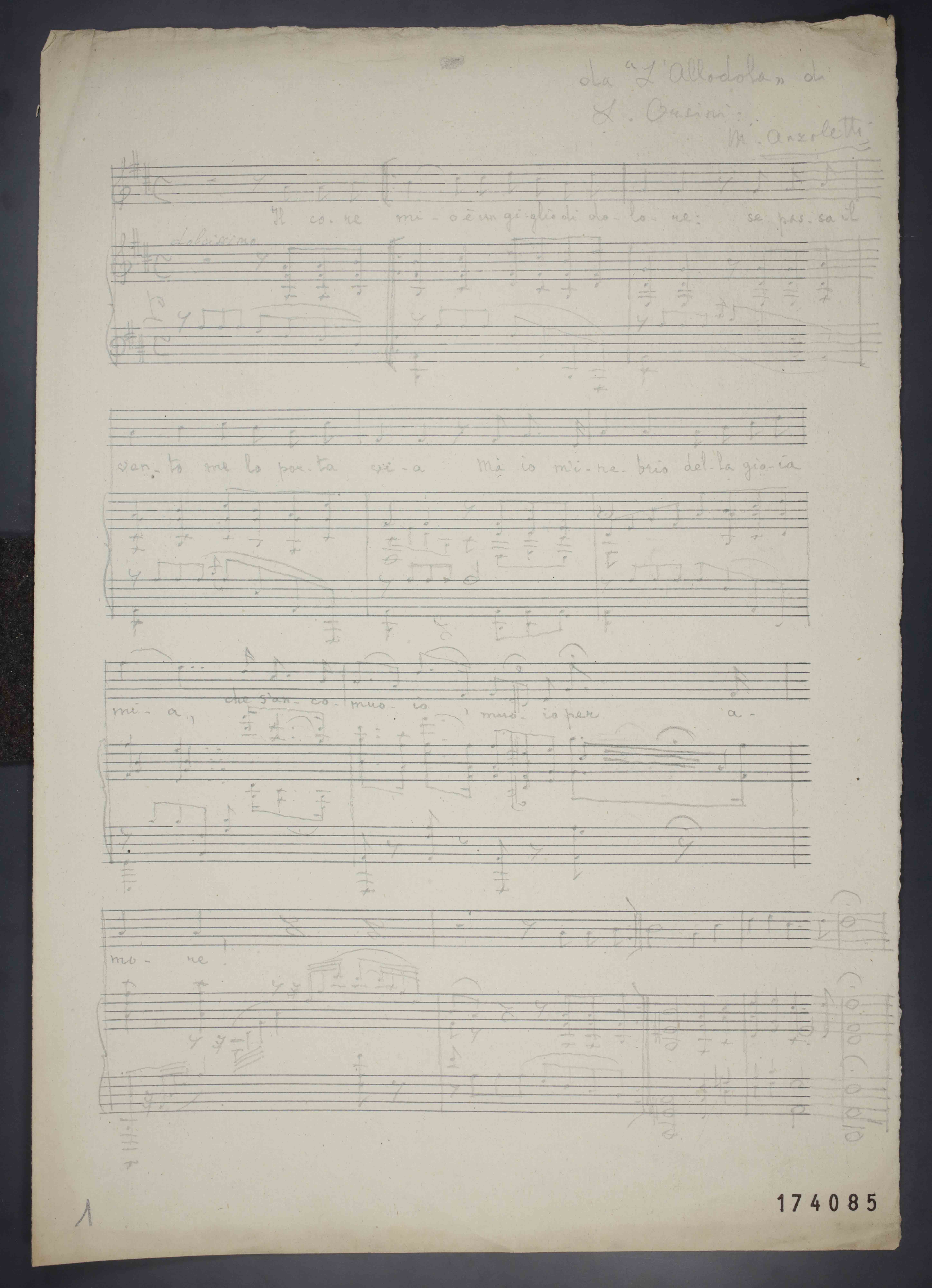 [1] c. , 33 cm. Ricevuto in deposito dalla Società Filarmonica di Trento nel 1941. Manoscritto autografo. Testo di Luigi Orsini