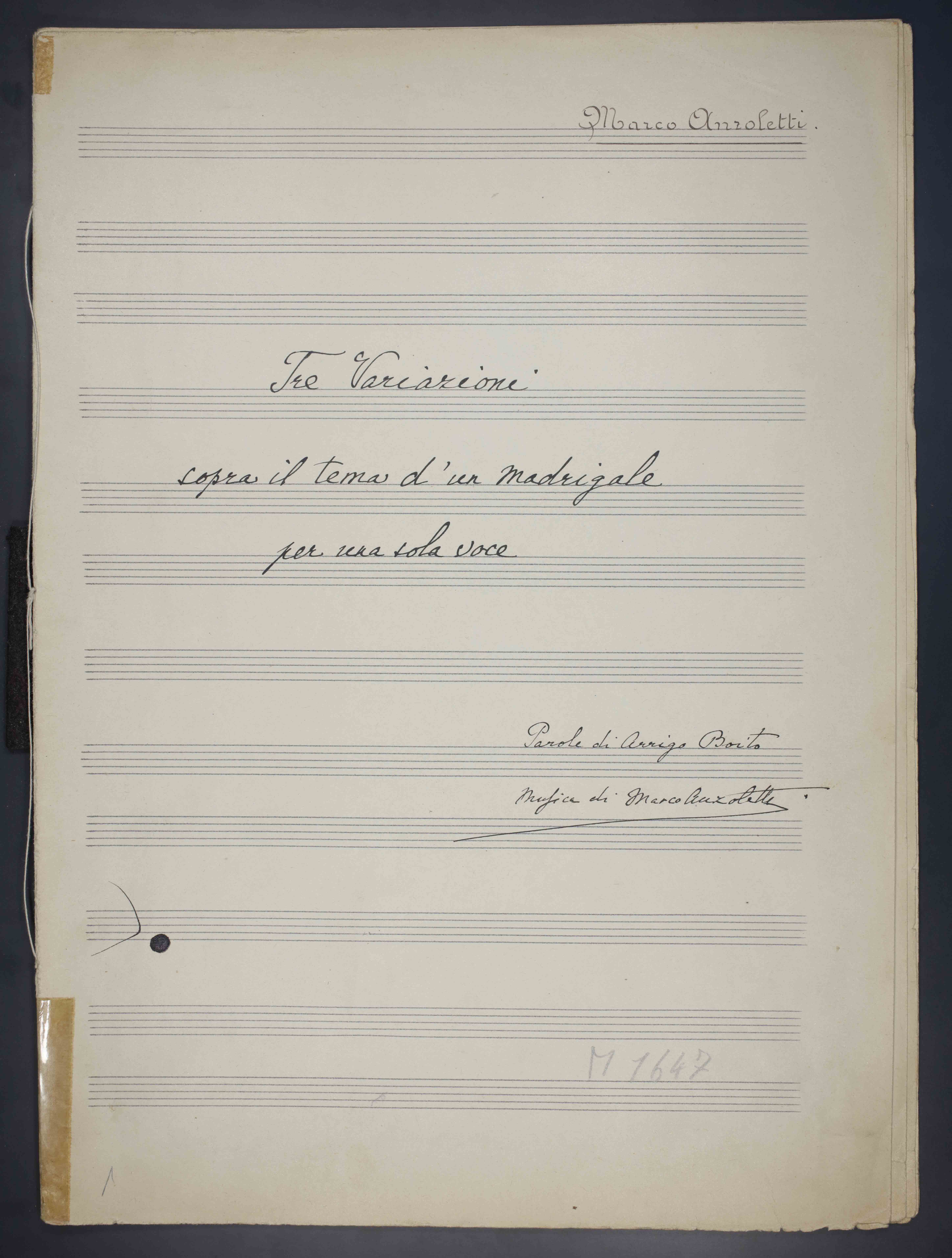 [6] c., 33 cm. Ricevuto in deposito dalla Società Filarmonica di Trento nel 1941. Manoscritto autografo. Testo di Arrigo Boito