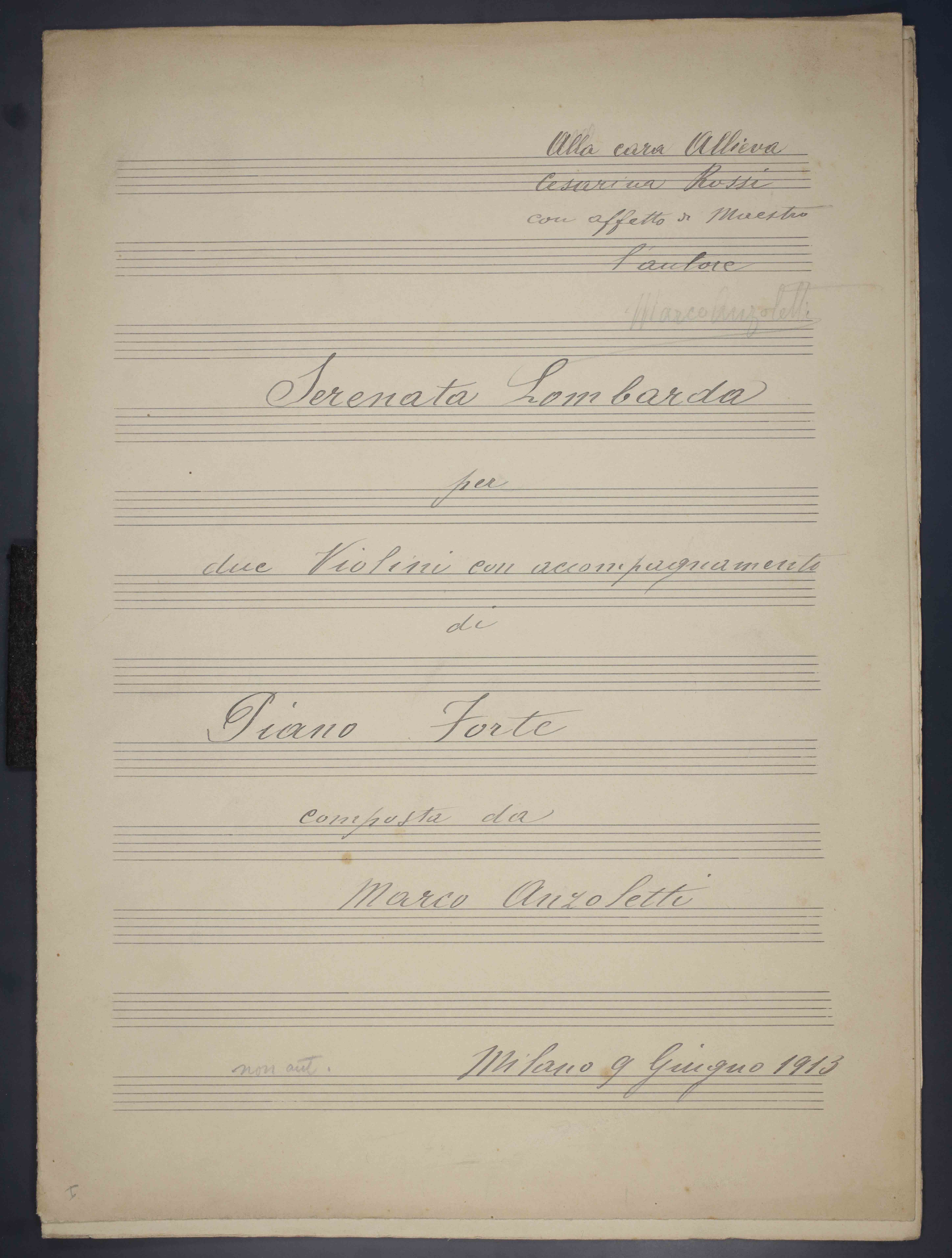 1 partitura ([2], 7, [3] p.) , 33 cm. Ricevuto in deposito dalla Società Filarmonica di Trento nel 1941. Manoscritto autografo. Dedica all’allieva Cesarina Rossi