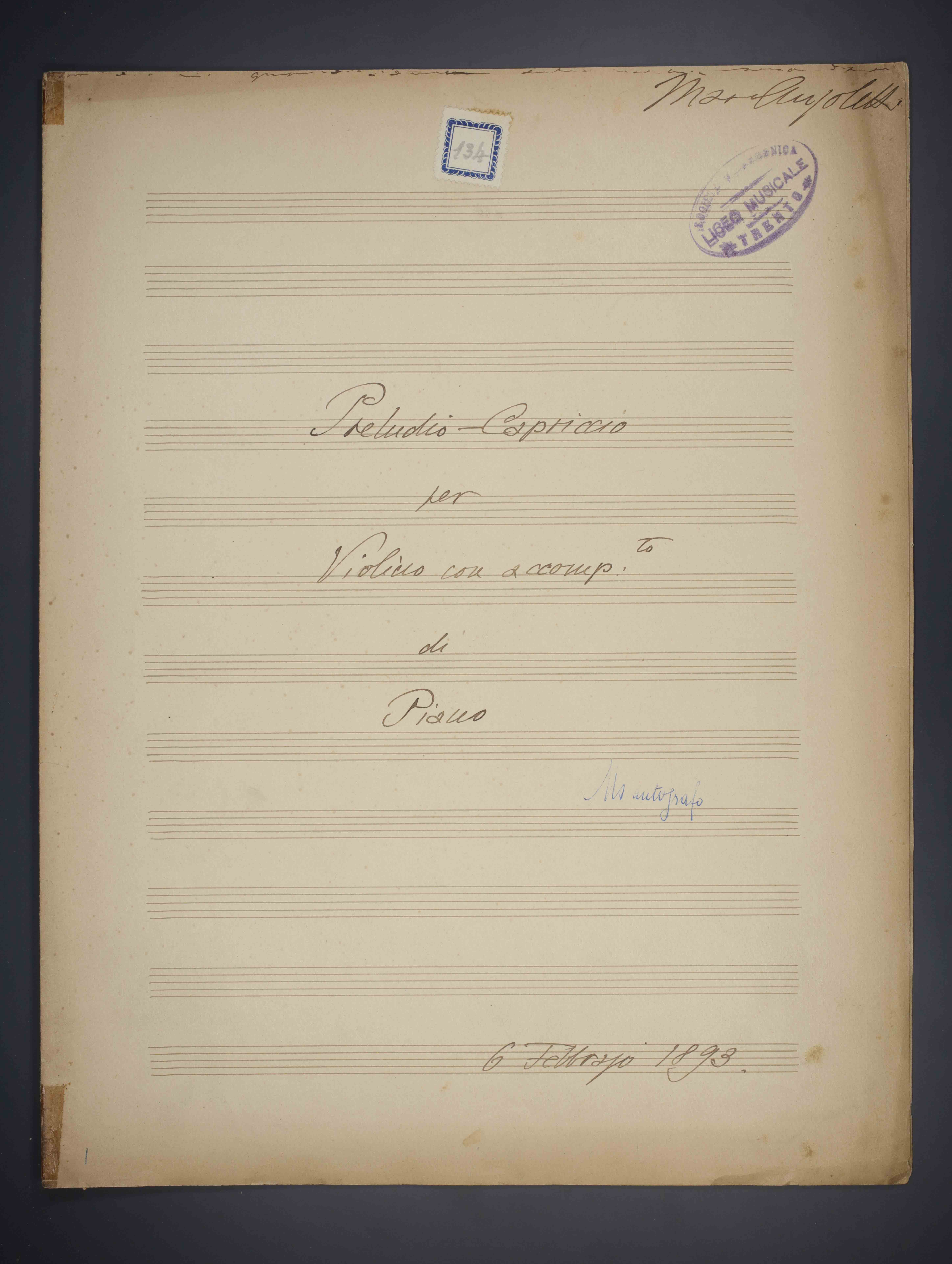 [6] c. , 33 cm. Ricevuto in deposito dalla Società Filarmonica di Trento nel 1941. Manoscritto autografo. Timbri del Liceo musicale - Società Filarmonica Trento a c. 1r e a c. 2r. Antica segnatura di collocazione a c. 1r: 134