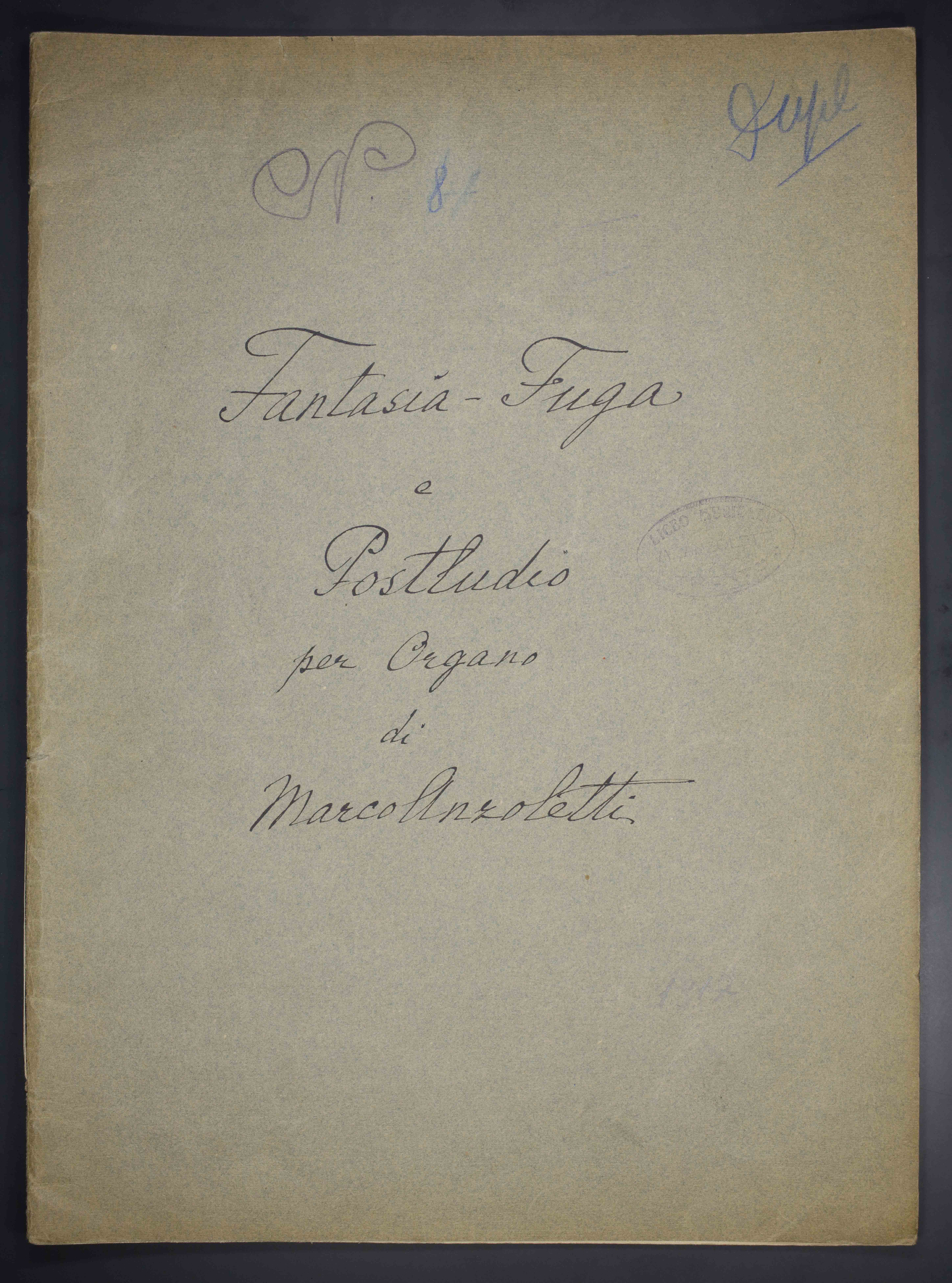 [2], 30 p. , 33 cm. Ricevuto in deposito dalla Società Filarmonica di Trento nel 1941. Manoscritto autografo. Timbro del Liceo musicale “M. Anzoletti” di Trento sulla cop. e del Liceo musicale - Società Filarmonica Trento a c. 1r.