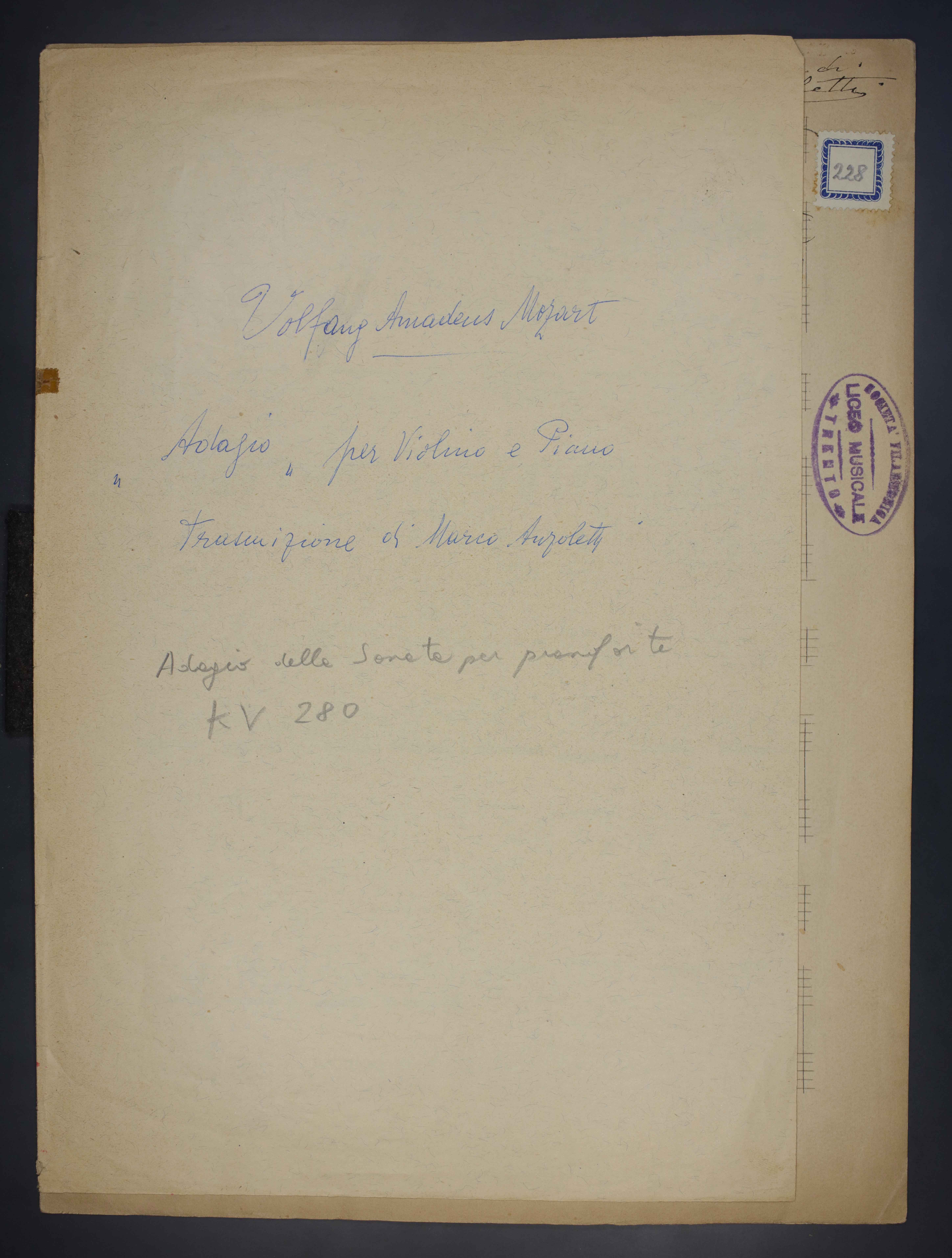 4] c. , 33 cm. Ricevuto in deposito dalla Società Filarmonica di Trento nel 1941. Manoscritto autografo. Timbro a c. 1r del Liceo musicale - Società Filarmonica Trento. Antica segnatura di collocazione a c. 1r: 228