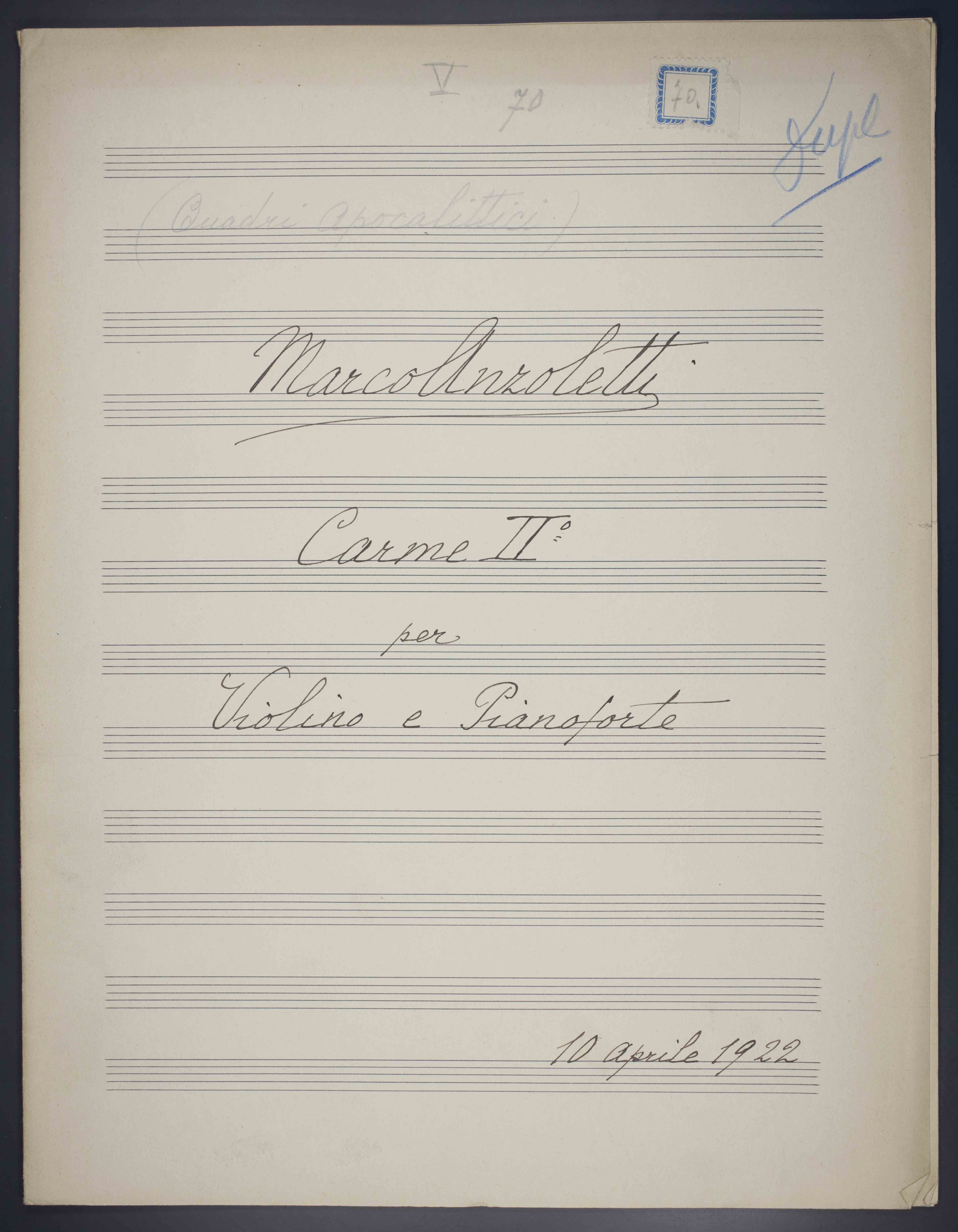 2 parti ([2], 6, [2]; 3, [1] p.) ; 34 cm. Ricevuto in deposito dalla Società Filarmonica di Trento nel 1941. Manoscritto autografo. Antica segnatura di collocazione a c. 1r: 70