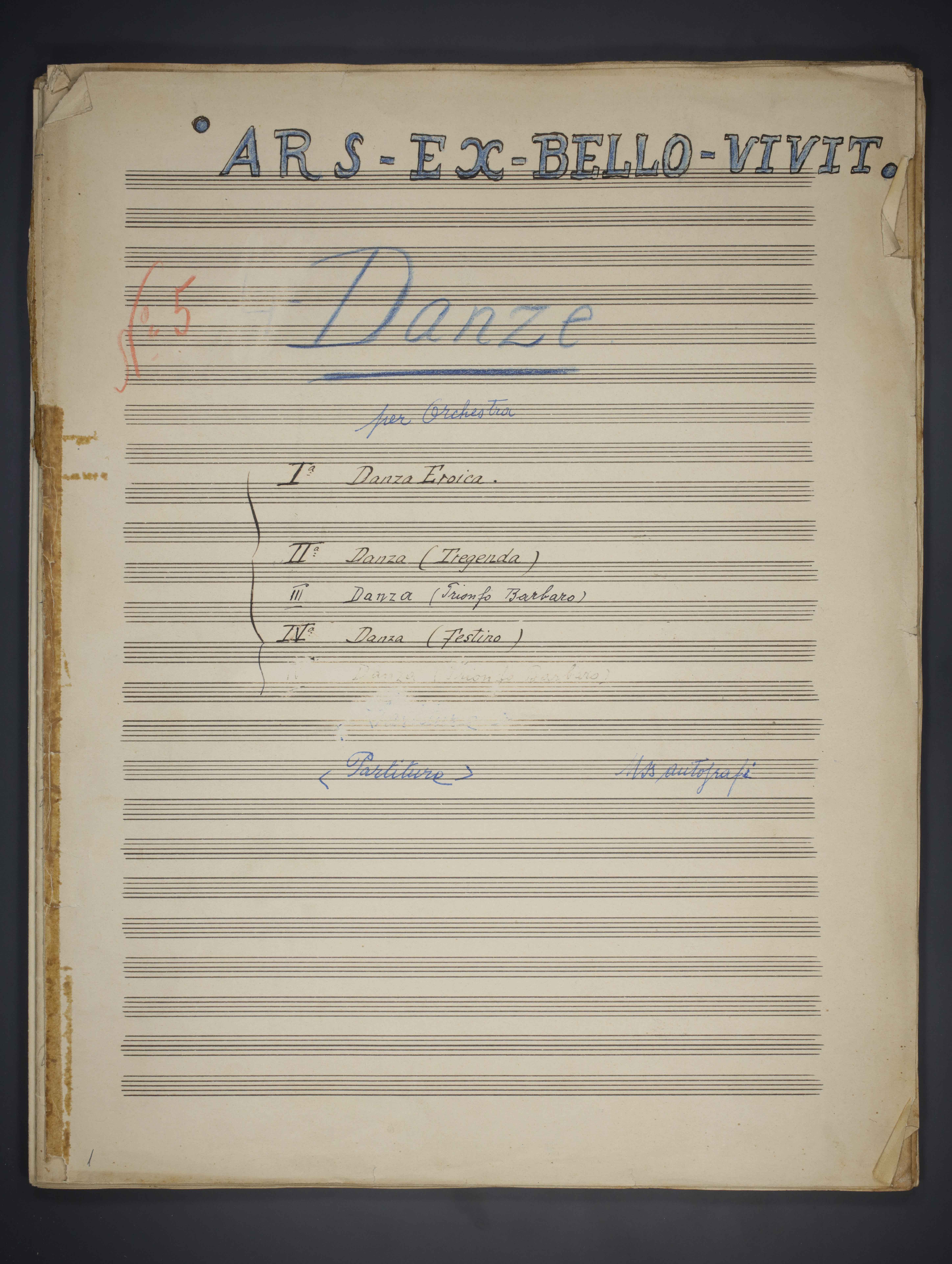 1 partitura ([46] c.) ; 34 cm. Ricevuto in deposito dalla Società Filarmonica di Trento nel 1941. Manoscritto autografo. In testa a c.[1] il motto: Ars ex bello vivit. A c.[2] dedica a Giulia Turco Lazzari. Contiene: Danza eroica ; Danza tregenda ; Trionfo barbaro ; Festino