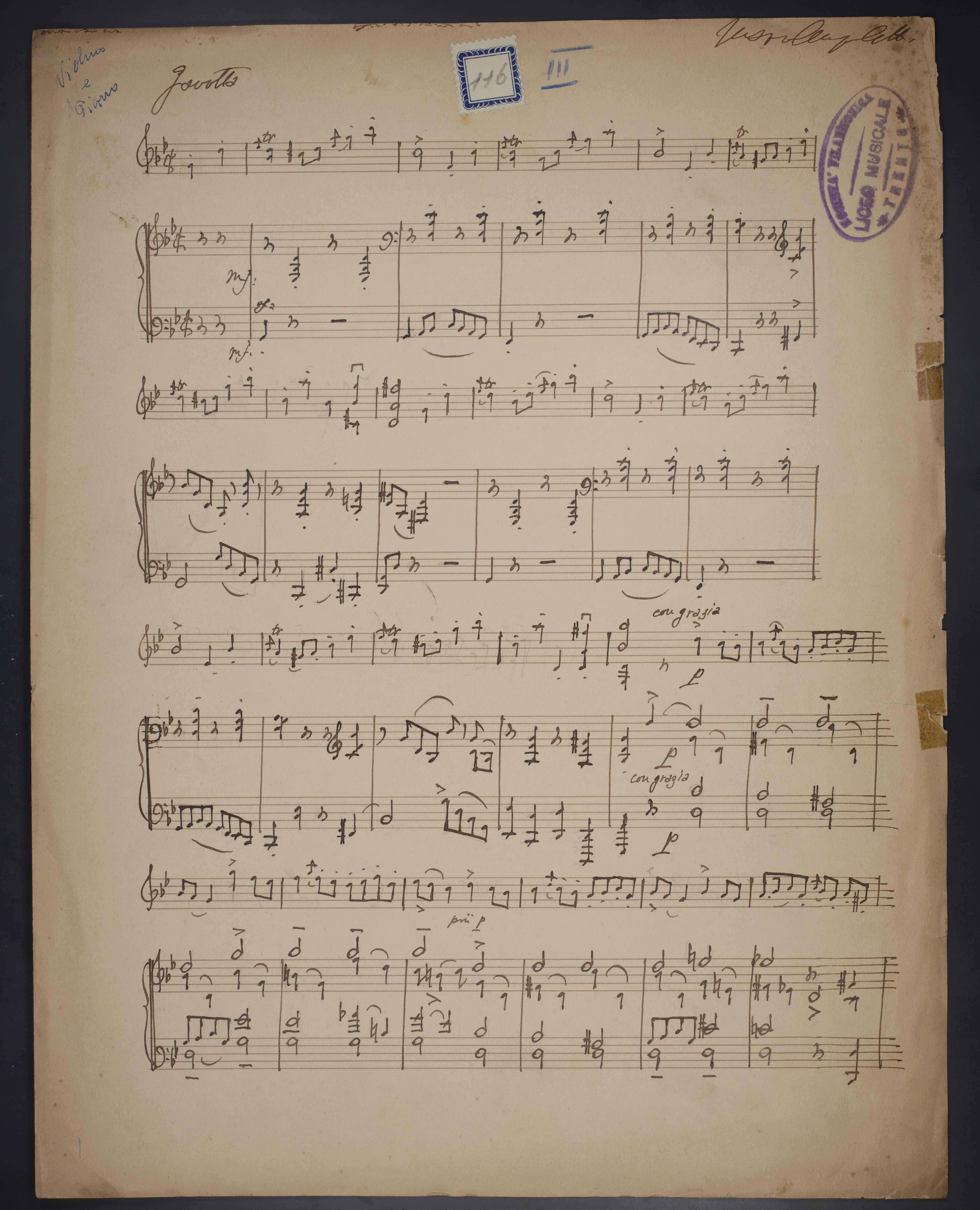 1 partitura ([2] c.) ; 33 cm. Ricevuto in deposito dalla Società Filarmonica di Trento nel 1941. Manoscritto autografo. Timbro del Liceo musicale - Società Filarmonica Trento a c. [1]r. Antica segnatura di collocazione sulla cop.: 116