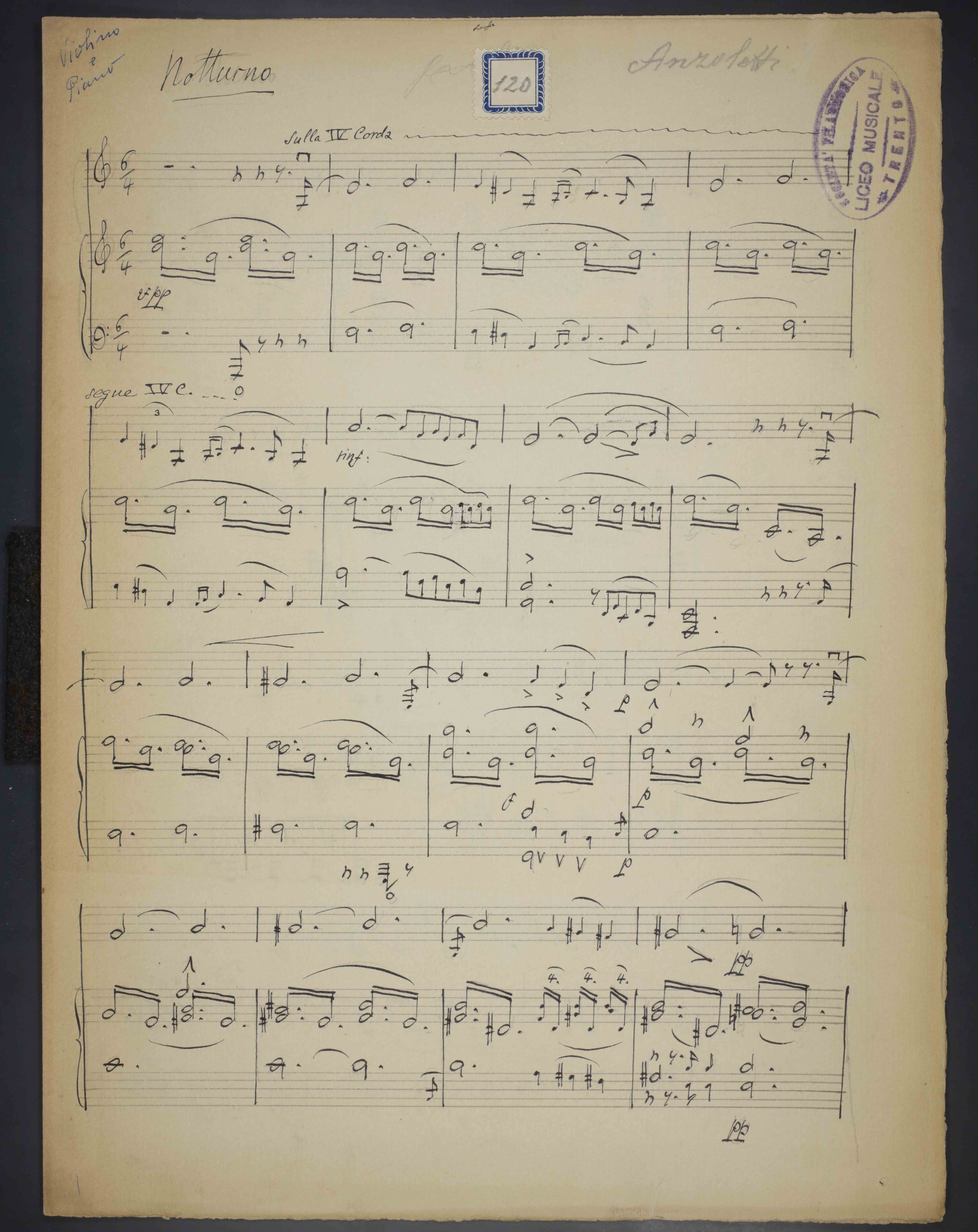 1 partitura ([2] c.) ; 33 cm. Ricevuto in deposito dalla Società Filarmonica di Trento nel 1941. Manoscritto autografo. Timbro del Liceo musicale - Società Filarmonica Trento a p. 1. Antica segnatura di collocazione a p. 1: 120