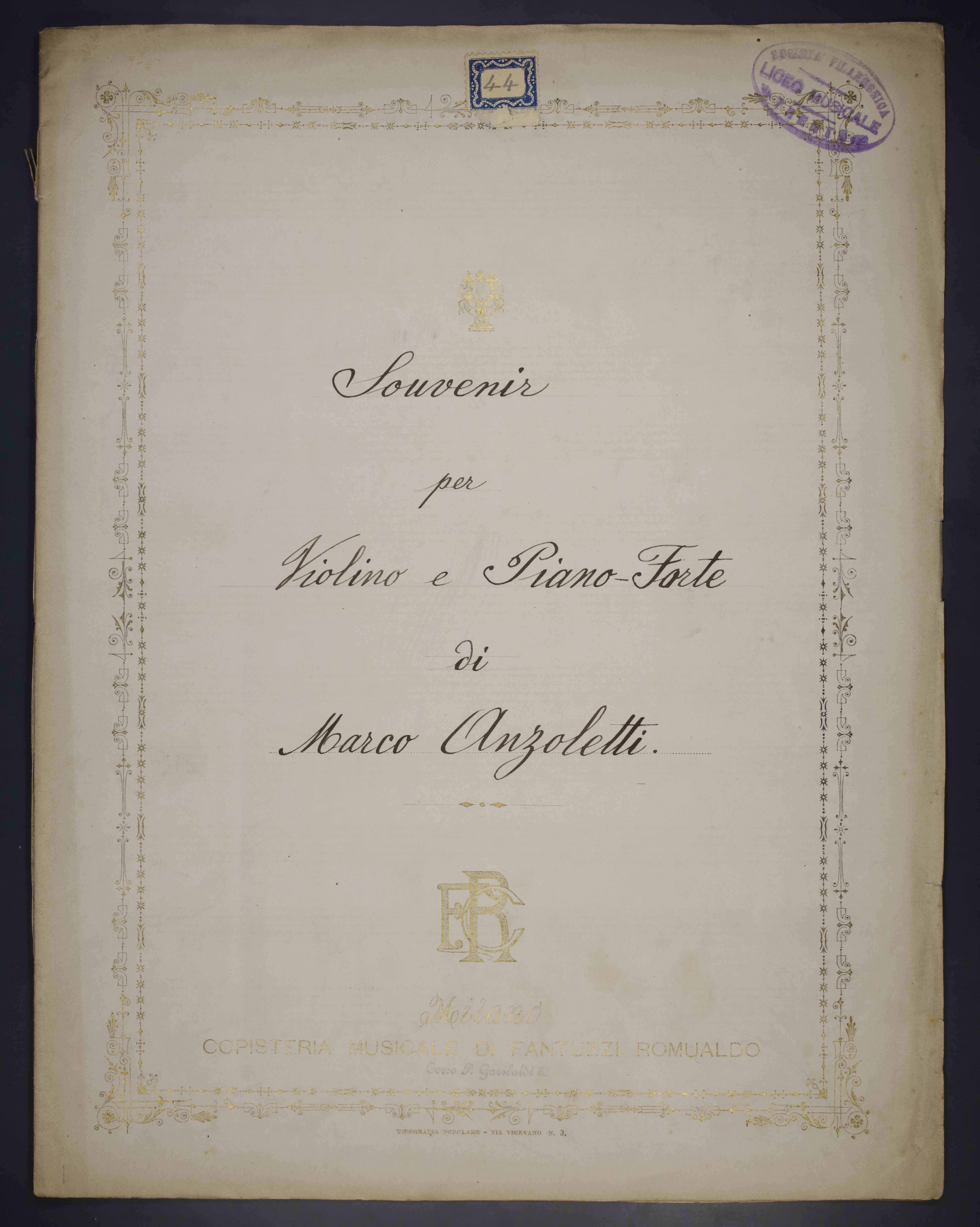 1 partitura ([5] c.) ; 33 cm. Ricevuto in deposito dalla Società Filarmonica di Trento nel 1941. Manoscritto autografo. Timbro del Liceo musicale - Società Filarmonica Trento sulla coperta. Antica segnatura di collocazione sulla cop.: 44