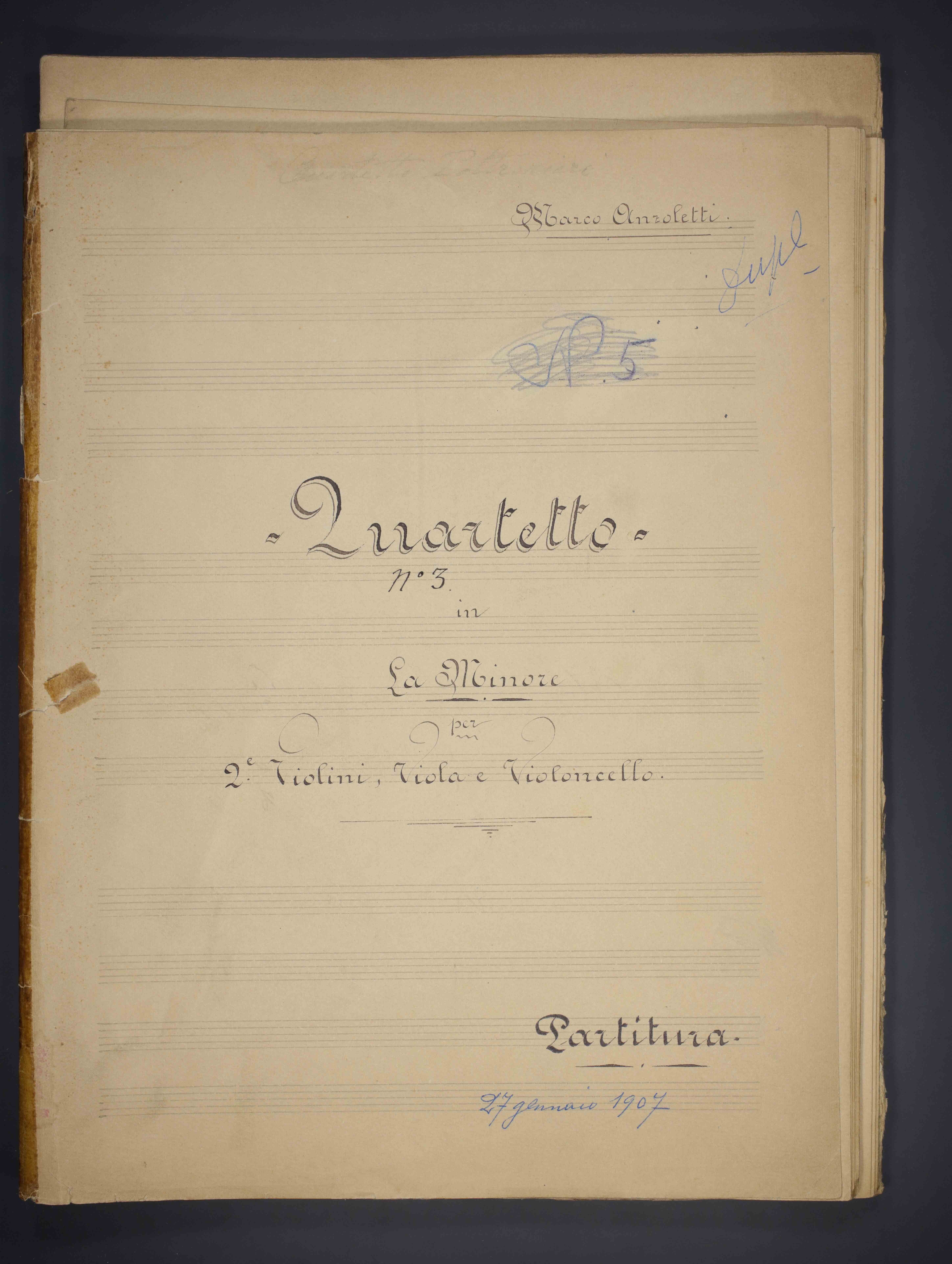 1 partitura ([2], 68, [2] p.) ; 33 cm + 4 parti ([40] c. Ricevuto in deposito dalla Società Filarmonica di Trento nel 1941. Manoscritto autografo. In testa alla coperta della partitura: Quartetto Poltronieri