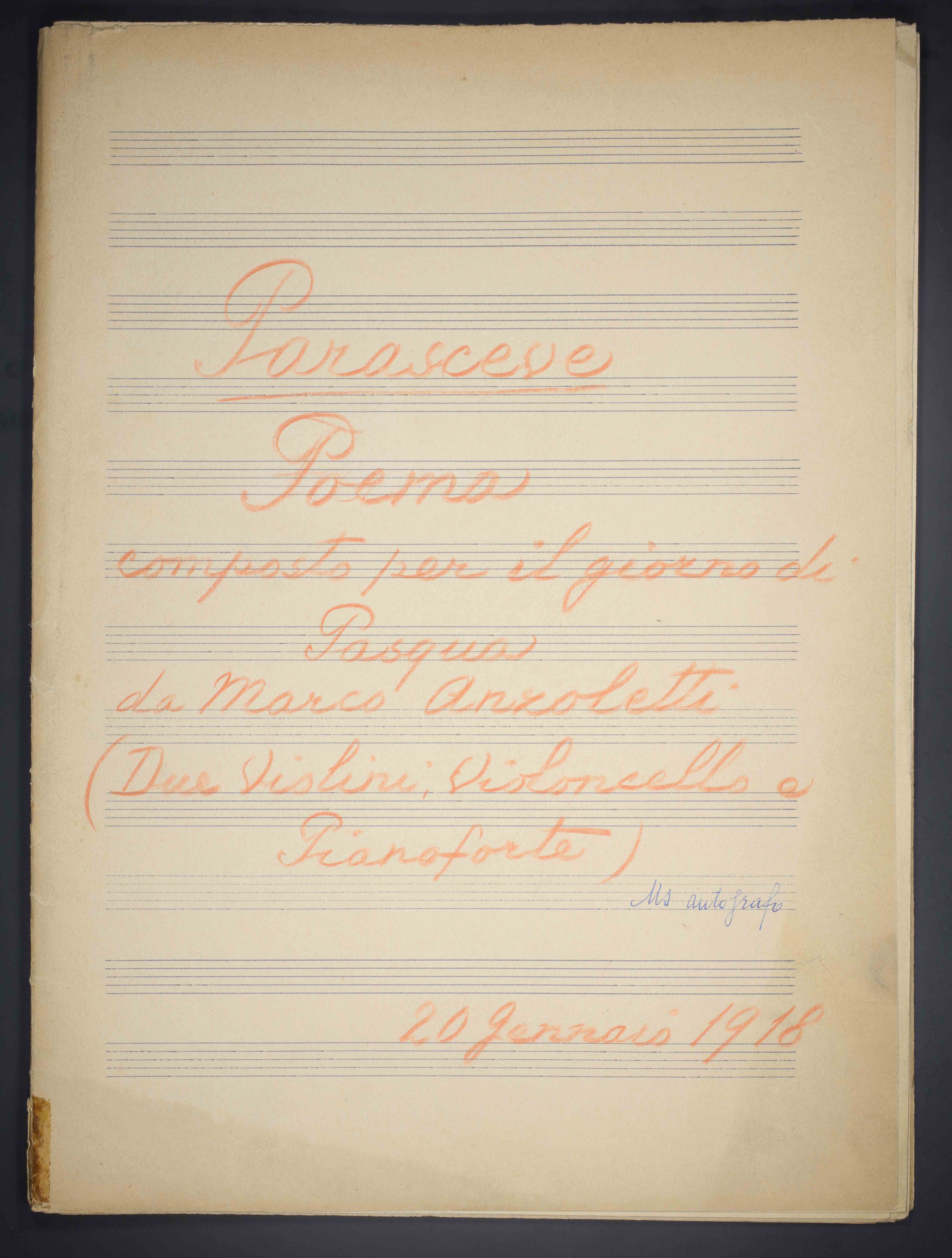 1 partitura ([2], 42, [2] p.) ; 33 cm. Ricevuto in deposito dalla Società Filarmonica di Trento nel 1941. Manoscritto autografo