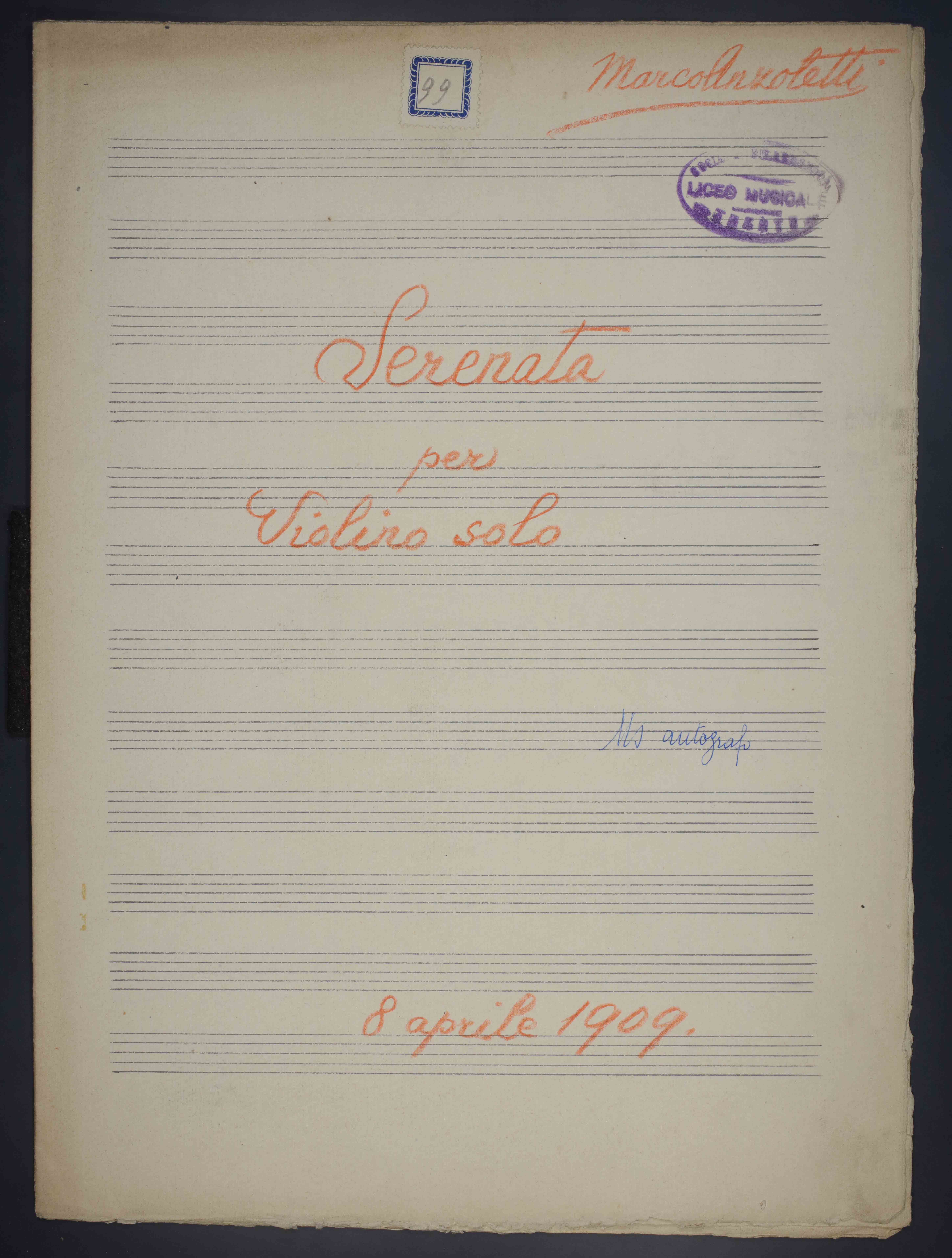 1 partitura [2], 3, [3] p. ; 34 cm. Ricevuto in deposito dalla Società Filarmonica di Trento nel 1941. Manoscritto autografo. Timbro del Liceo musicale - Società Filarmonica Trento sulla coperta e a p. 1. Sulla coperta antica segnatura di collocazione: 99