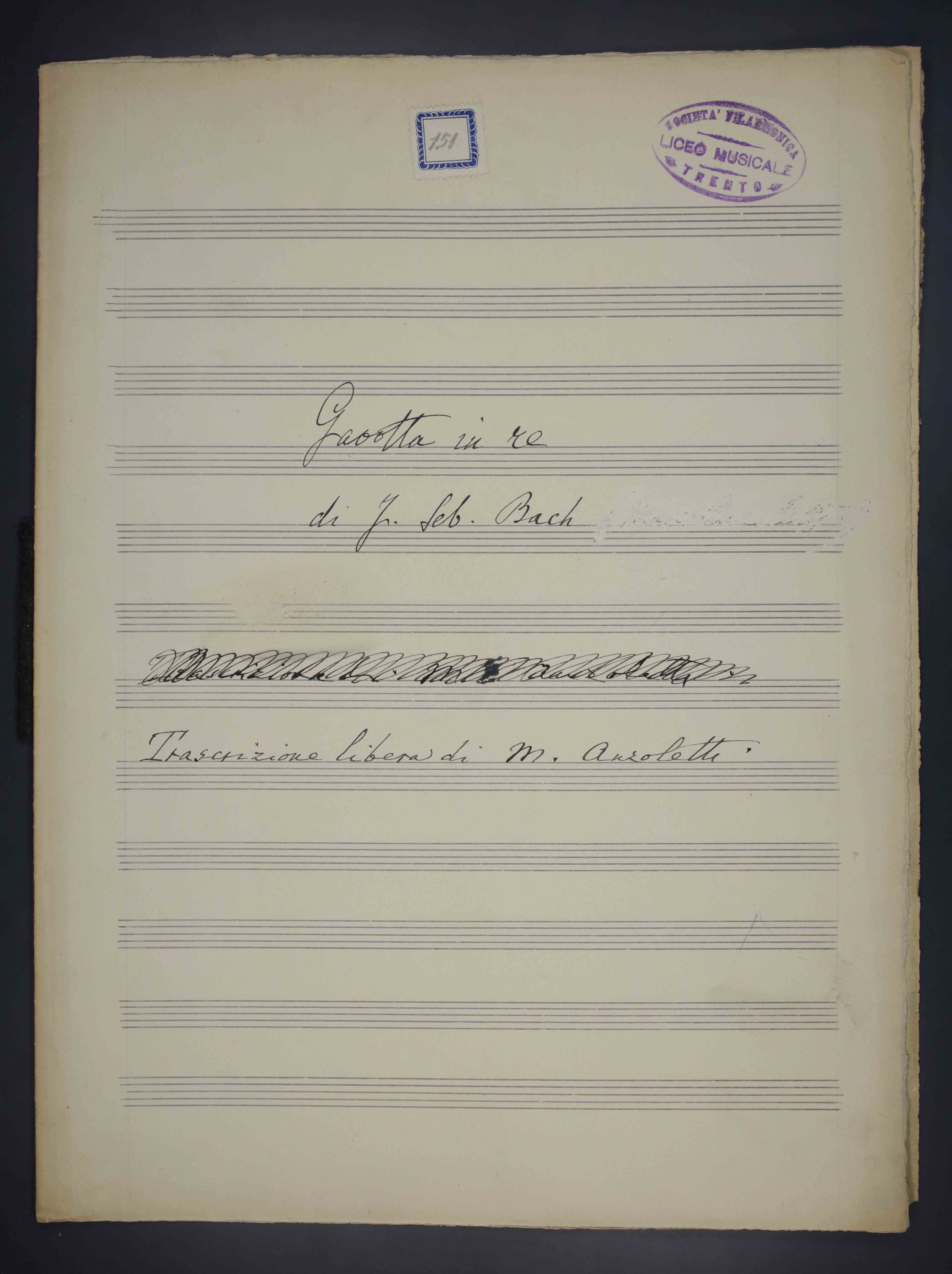 1 partitura ([3], 4, [1] p.) ; 33 cm. Ricevuto in deposito dalla Società Filarmonica di Trento nel 1941. Manoscritto autografo. Timbro del Liceo musicale - Società Filarmonica Trento sulla coperta. Sulla coperta antica segnatura di collocazione: 151