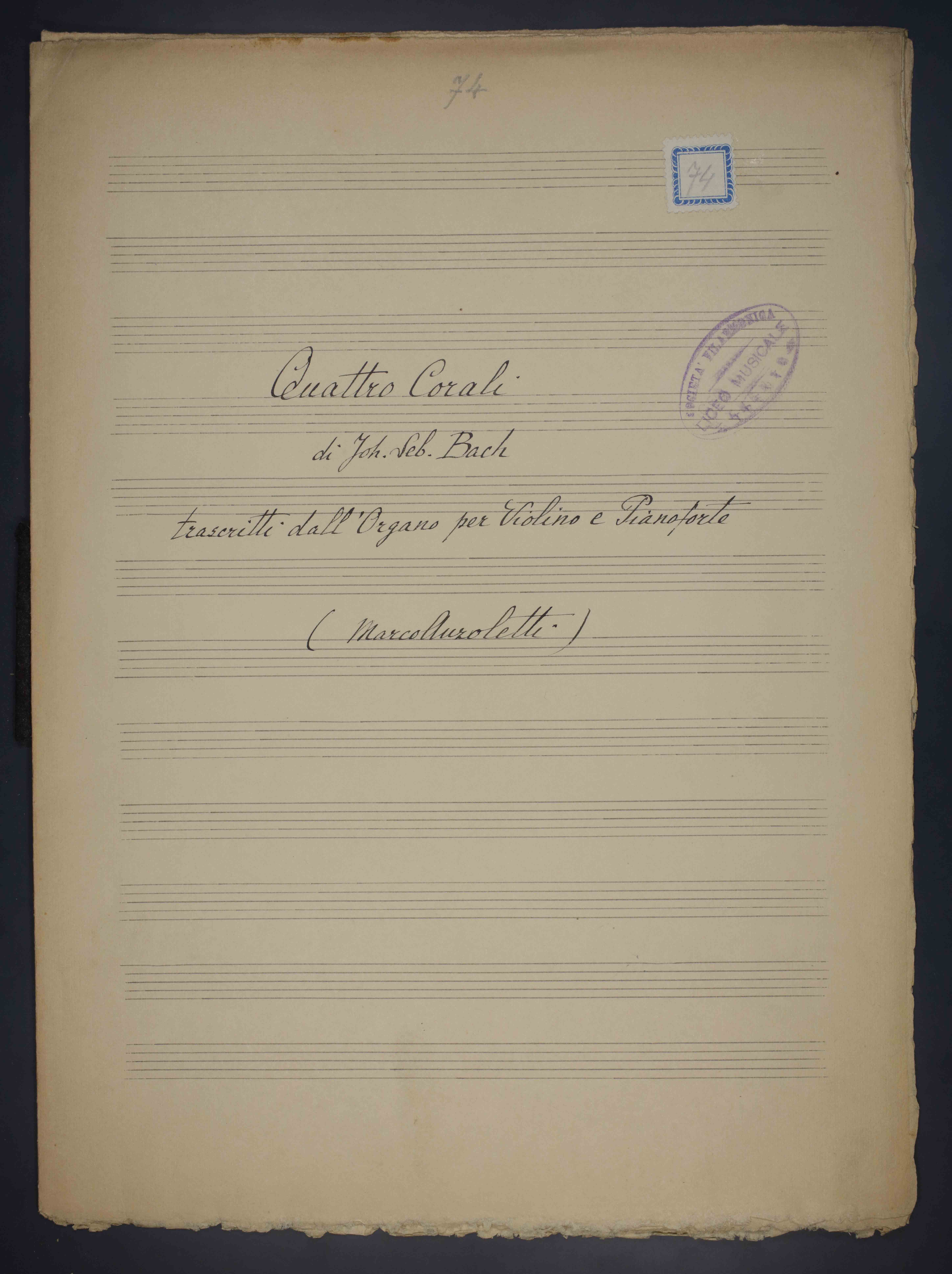 1 partitura ([2], 5, [1] p.) ; 33 cm. Ricevuto in deposito dalla Società Filarmonica di Trento nel 1941. Manoscritto autografo. Timbri del Liceo musicale - Società Filarmonica Trento sulla coperta e a p. 1. Sulla coperta antica segnatura di collocazione: 74