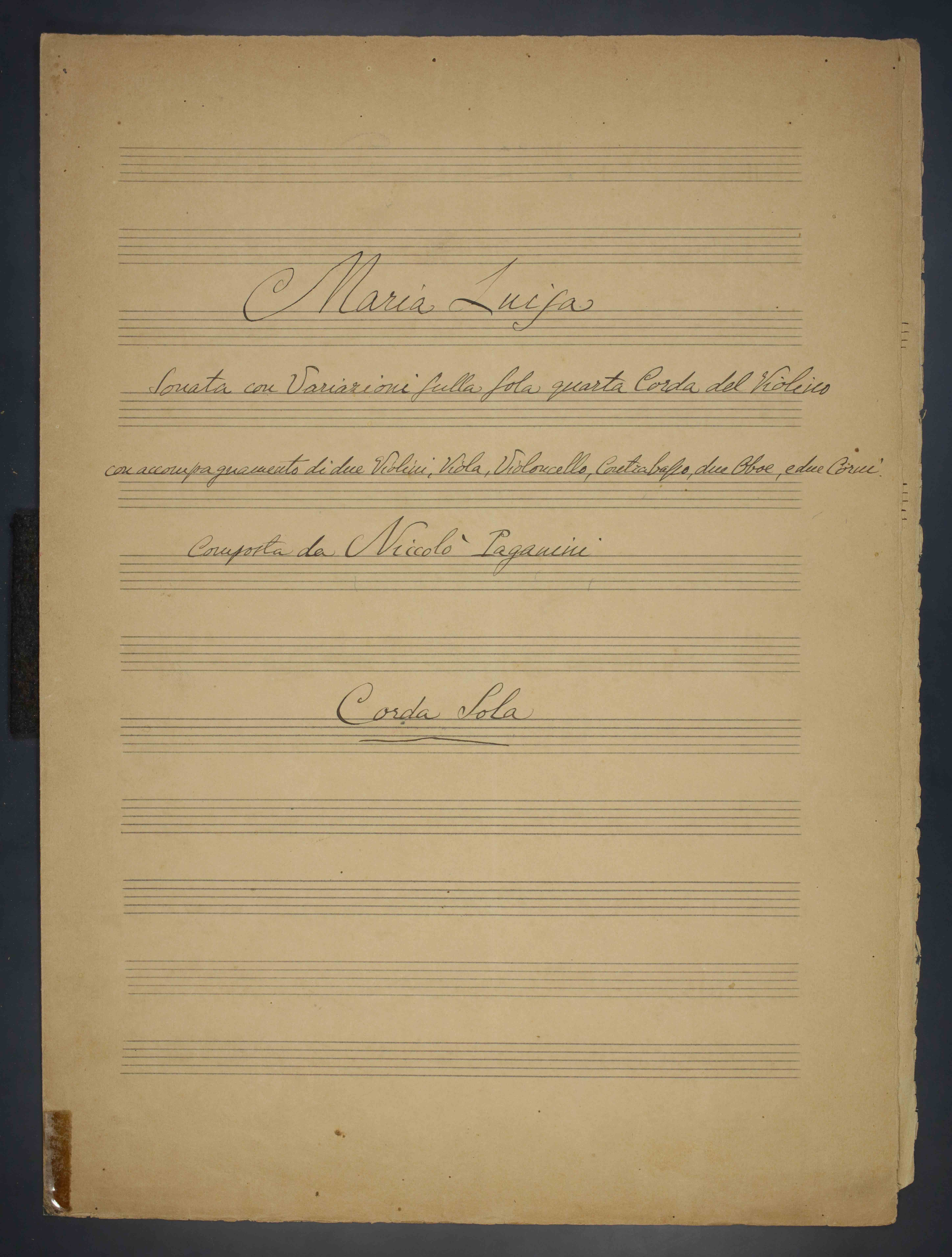 | Maria Luisa : sonata con variazioni sulla sola quarta corda del violino con accompagnamento di due violini, viola, violoncello, contrabasso, due oboe, e due corni |
