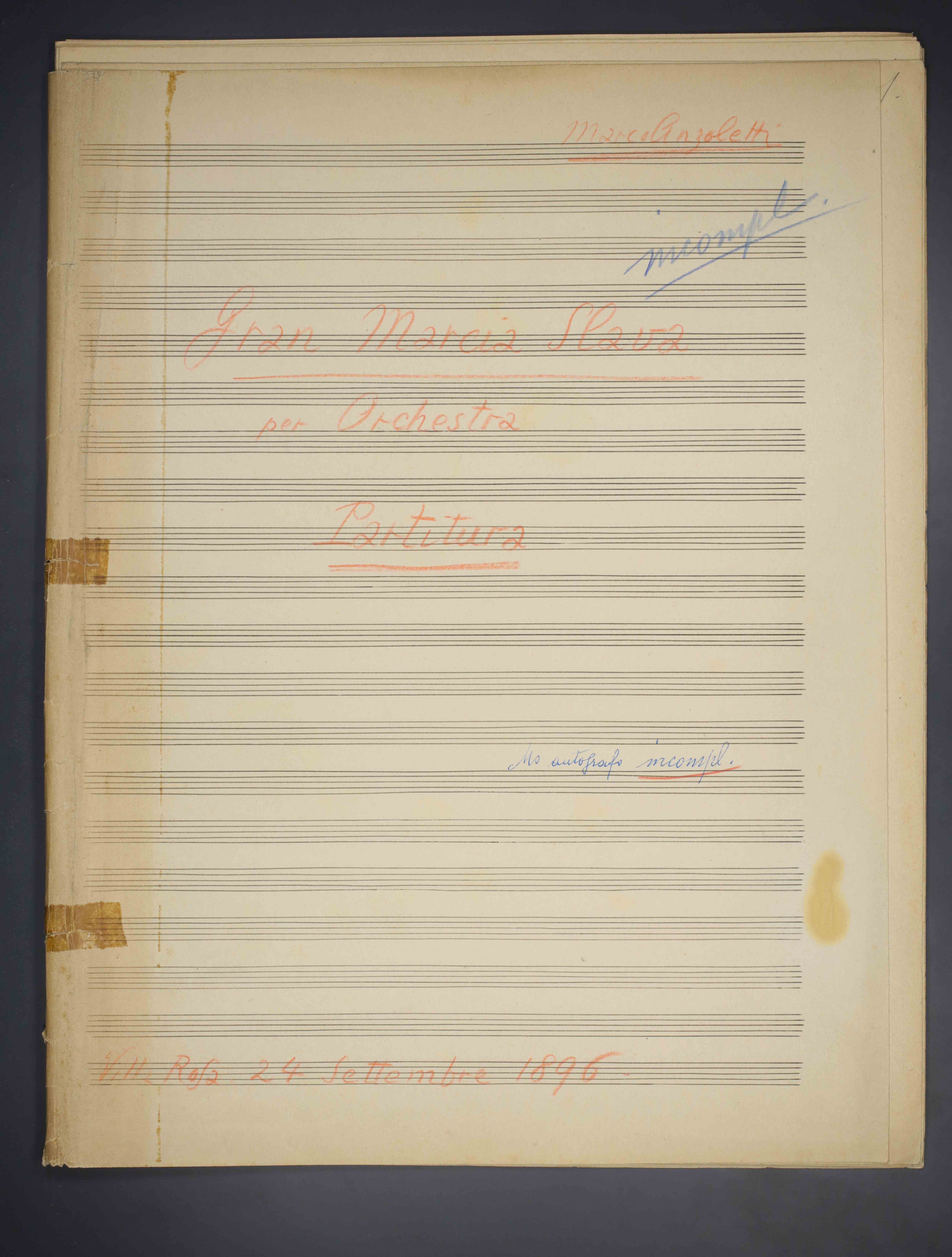 1 partitura ([2], 37 p.) ; 33 cm. Ricevuto in deposito dalla Società Filarmonica di Trento nel 1941. Manoscritto autografo
