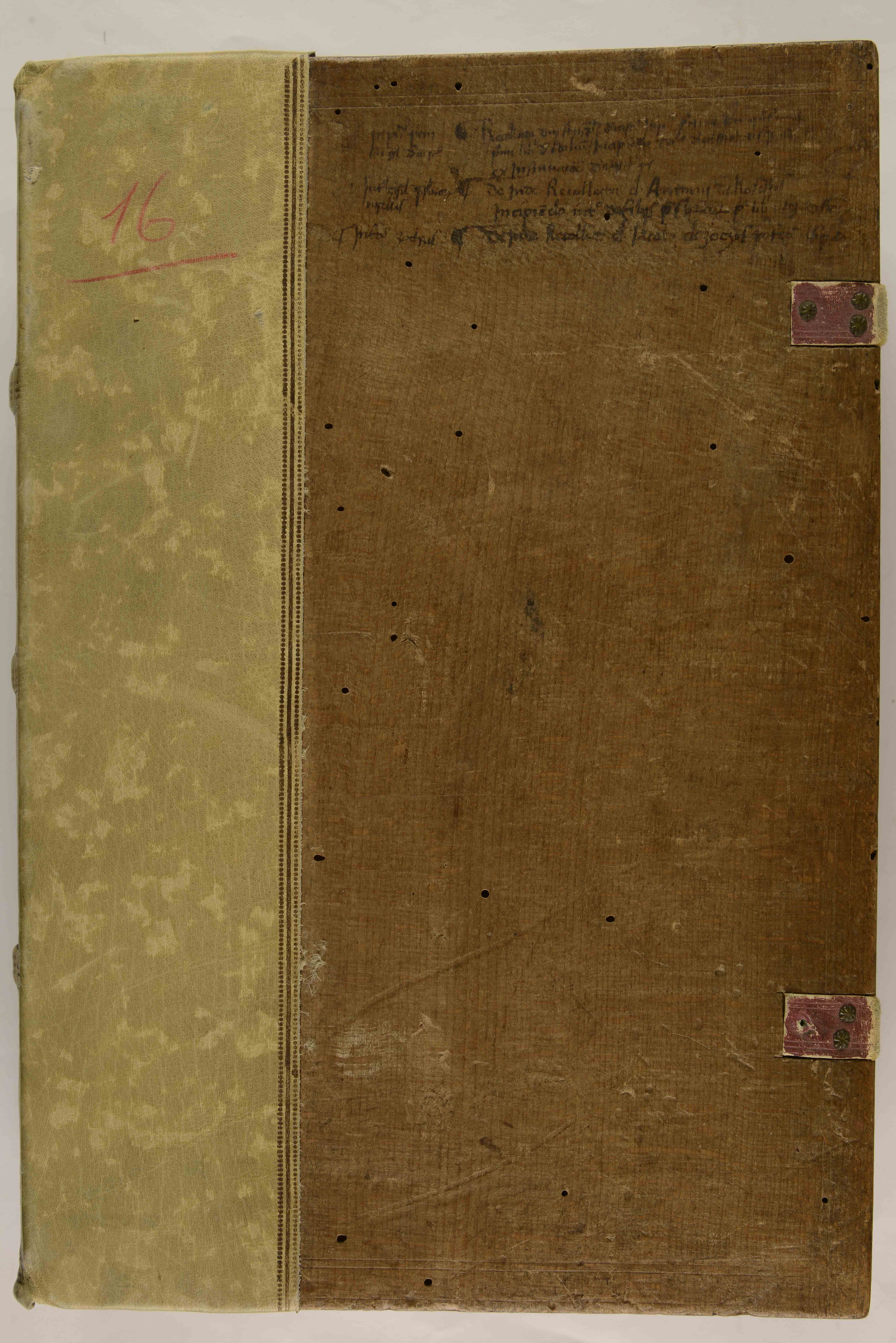 Cart.; ff. III, 281 (pp. 582), VII'; 344 × 245. Legatura antica su assi con rinforzo del dorso di epoca recente; tracce delle bindelle in pelle tinta di rosso; sul piatto anteriore indice del contenuto di mano del sec. XV.