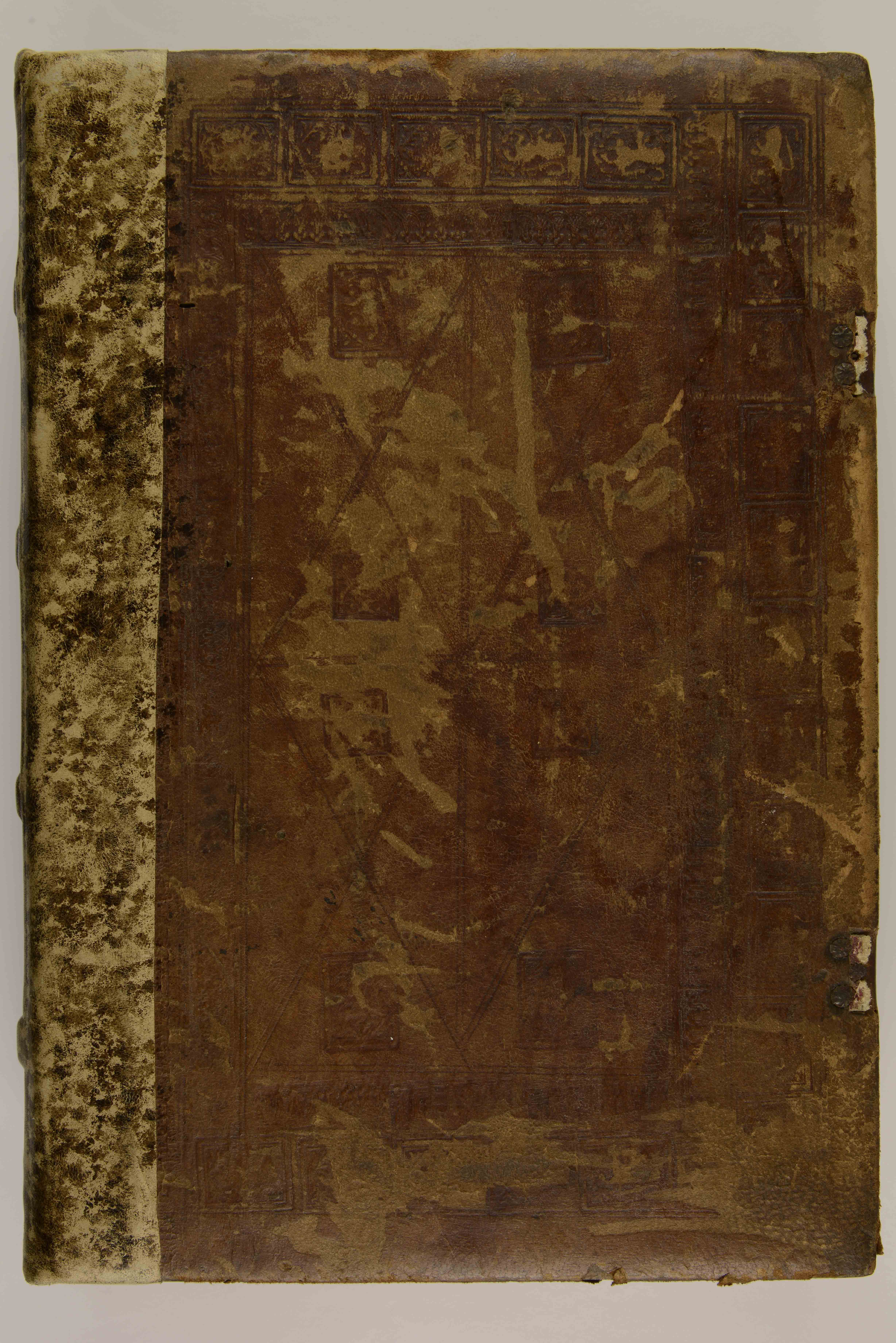 Cart.; ff. III, 240 (pp. 486), IV'; 1-2012; richiami entro cartiglio; in-folio; 302 × 211 = 24 [216] 62 × 25 [147] 39; rr. 40 / ll. 39; rigatura a colore. Una pagina ornata con motivi fitomorfi e due stemmi (p. 3), 16 iniziali fitomorfe, iniziali filigranate, titoli e sottoscrizioni in rosso; segni di paragrafo in verde, rosso e blu, ritocchi delle maiuscole in giallo. Legatura antica su assi ricoperte in pelle impressa a secco con dorso rifatto in epoca moderna; contrograffe e tracce di bindelle.