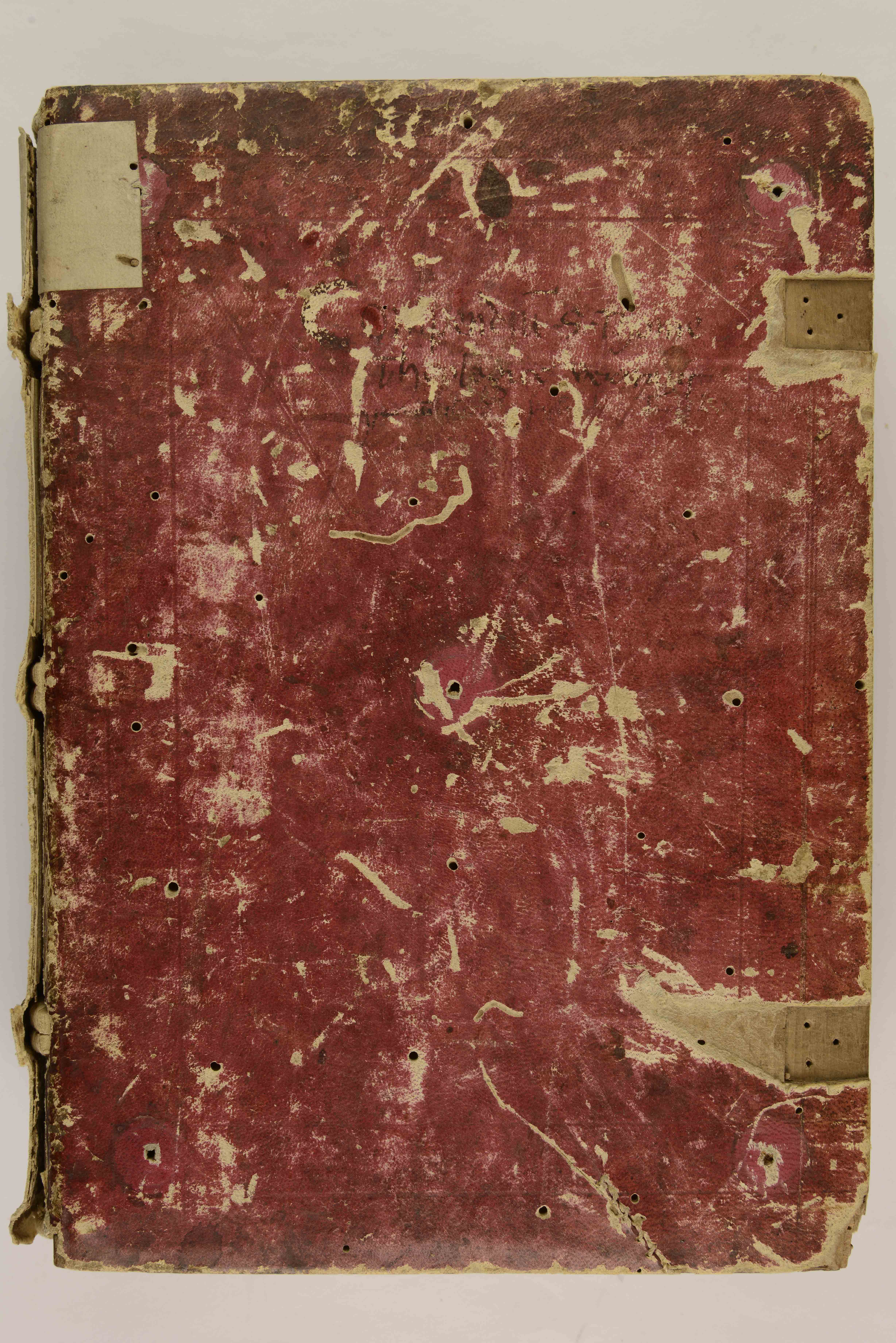 Cart.; ff. X, 279 (pp. 578)*; 294 × 209. Legatura antica su assi ricoperte in pelle allumata tinta di rosso; tracce di fermagli e di borchie; titolo sul piatto anteriore.