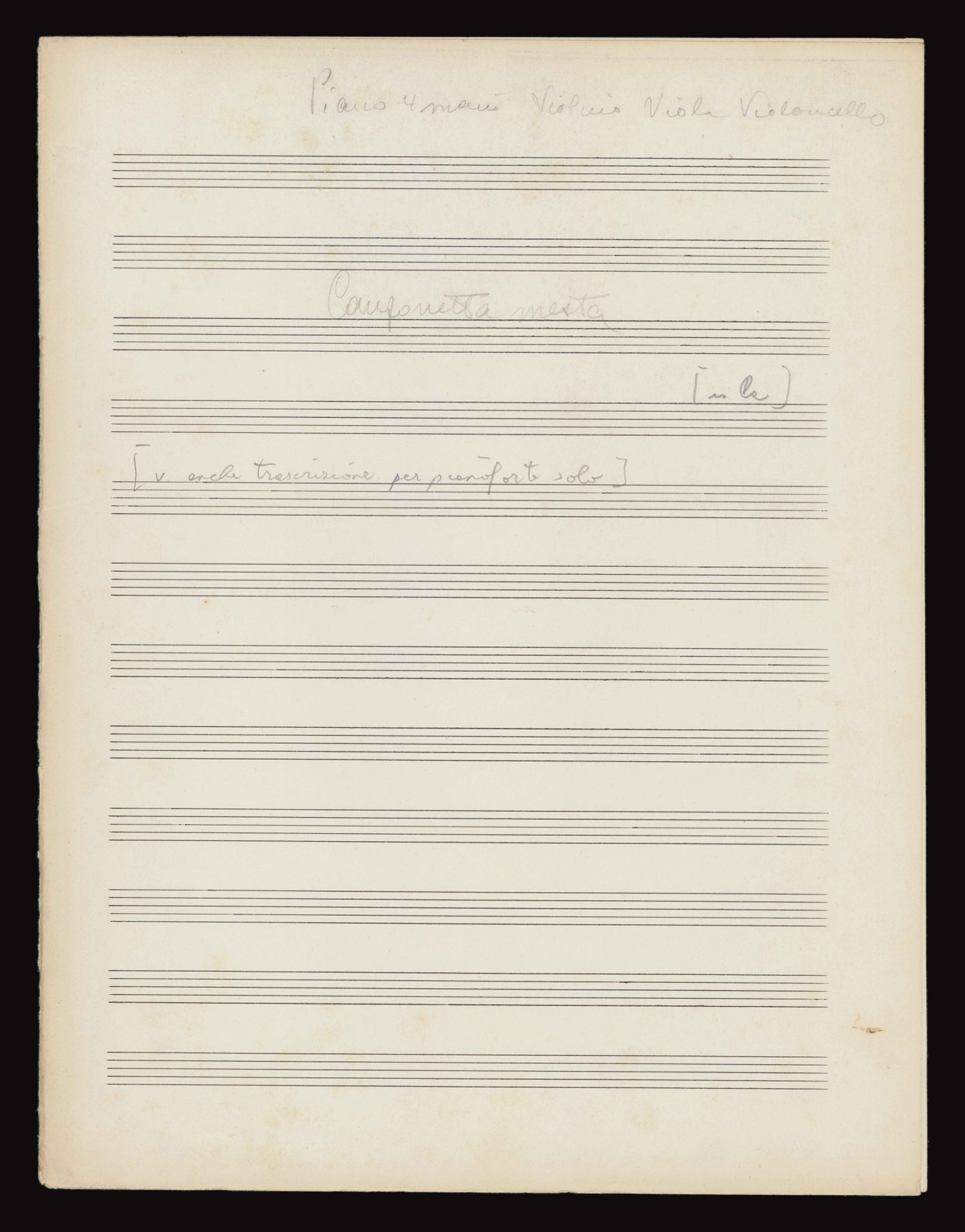 1 partitura ([4] c.) ; 34 cm + 4 parti ([13] c.). Ricevuto in dono da Aldo Alberti Poja nel 1940. Manoscritto autografo.