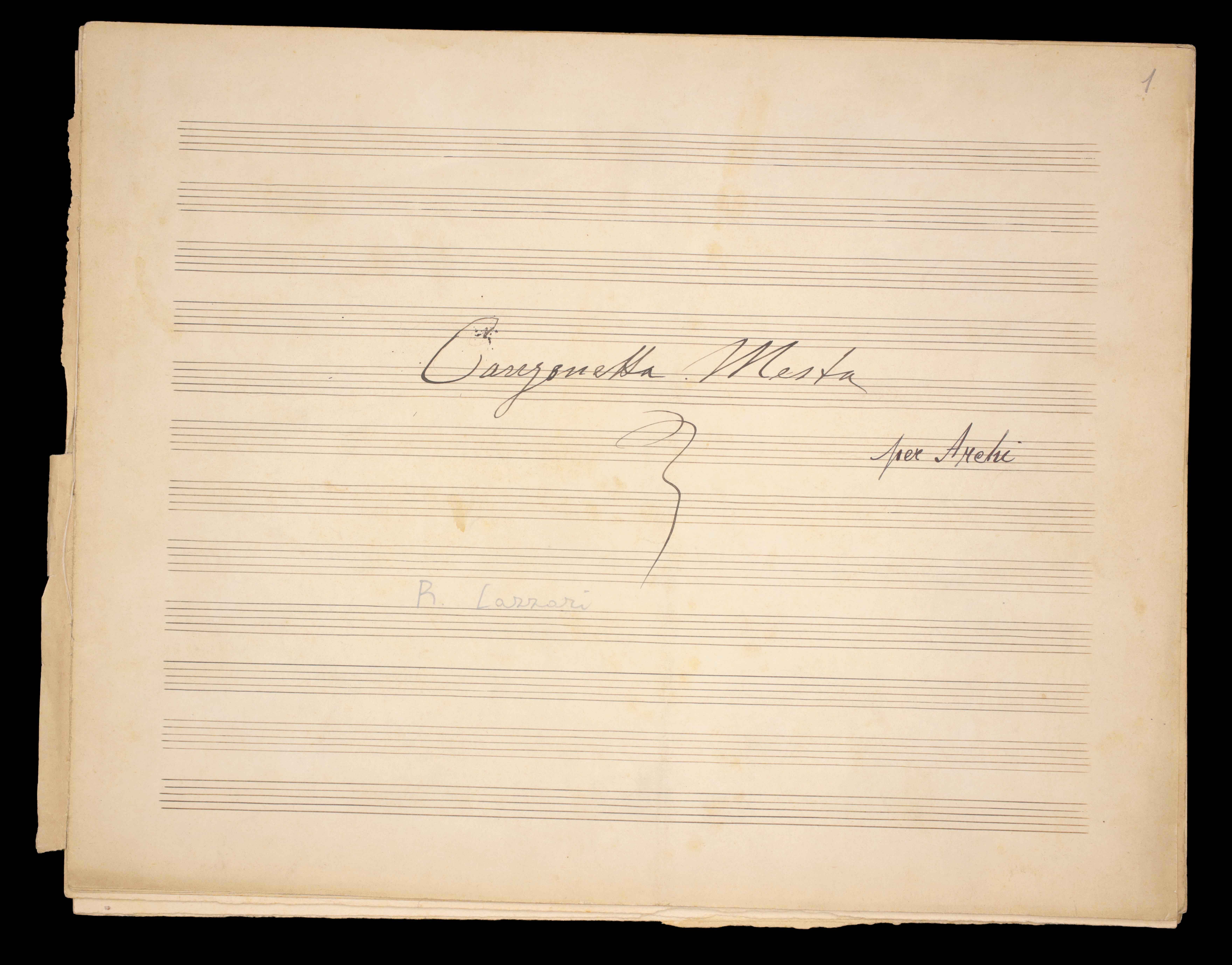 1 partitura ([5] c.) ; 34 cm + 7 parti ([8] c.). Ricevuto in dono da Aldo Alberti Poja nel 1940. Manoscritto autografo