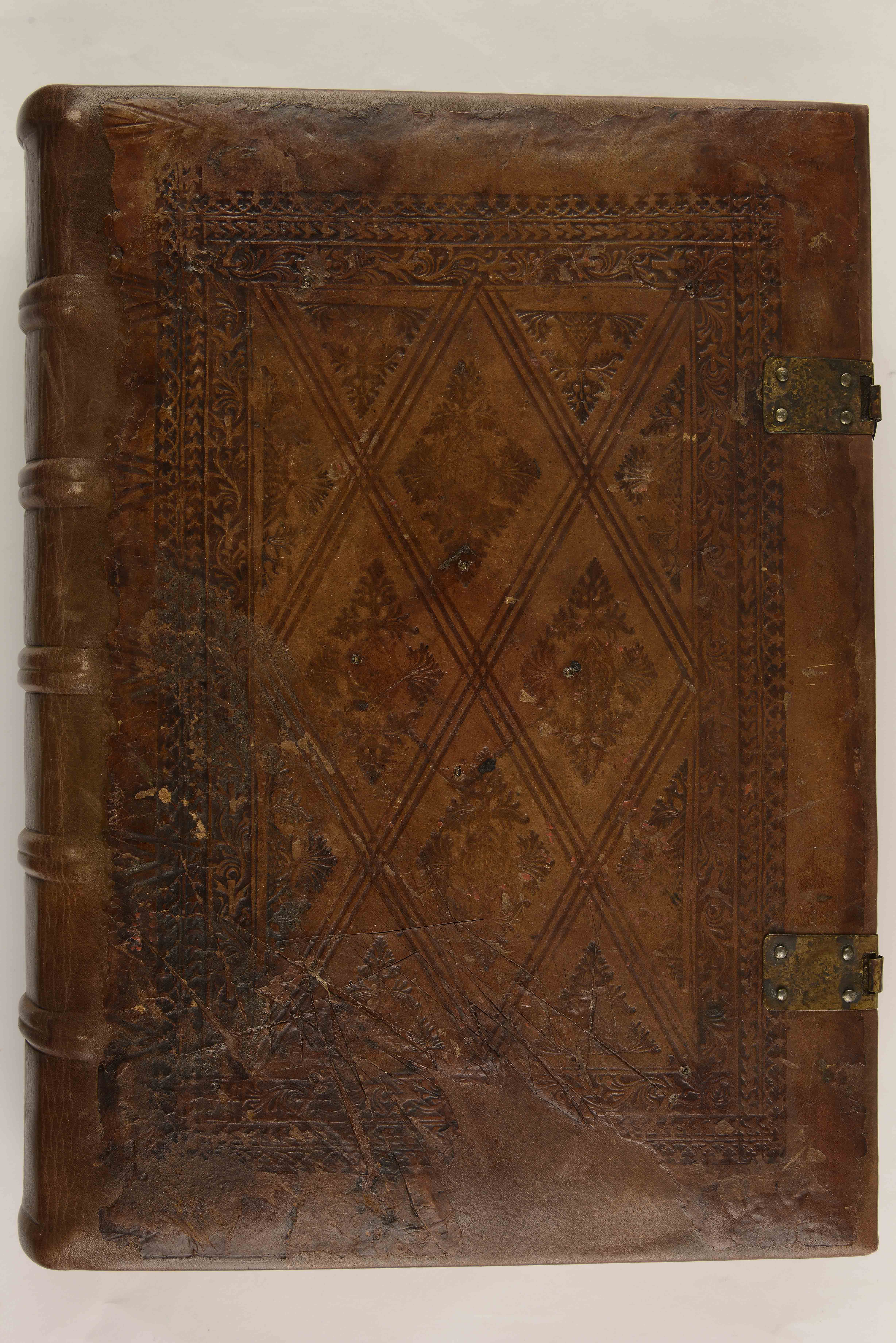 Cart.; ff. V, 202, V'*; 1-1012, 1110, 12-1412, 1510, 1612, 1714; segnatura a registro; in-folio; 282 × 205 = 22 [216] 44 × 18 [67 (15) 67] 38; rr. 2 / ll. 35 variabili; rigatura a colore; almeno due mani. Iniziale filigranata blu (f. 1rA); iniziali semplici e segni di paragrafo (solo ai ff. 135r-142r) in rosso e blu; ritocchi delle maiuscole in rosso. Legatura di restauro su assi ricoperte in cuoio con parziale recupero della coperta in cuoio impresso a secco e di graffe e contrograffe.