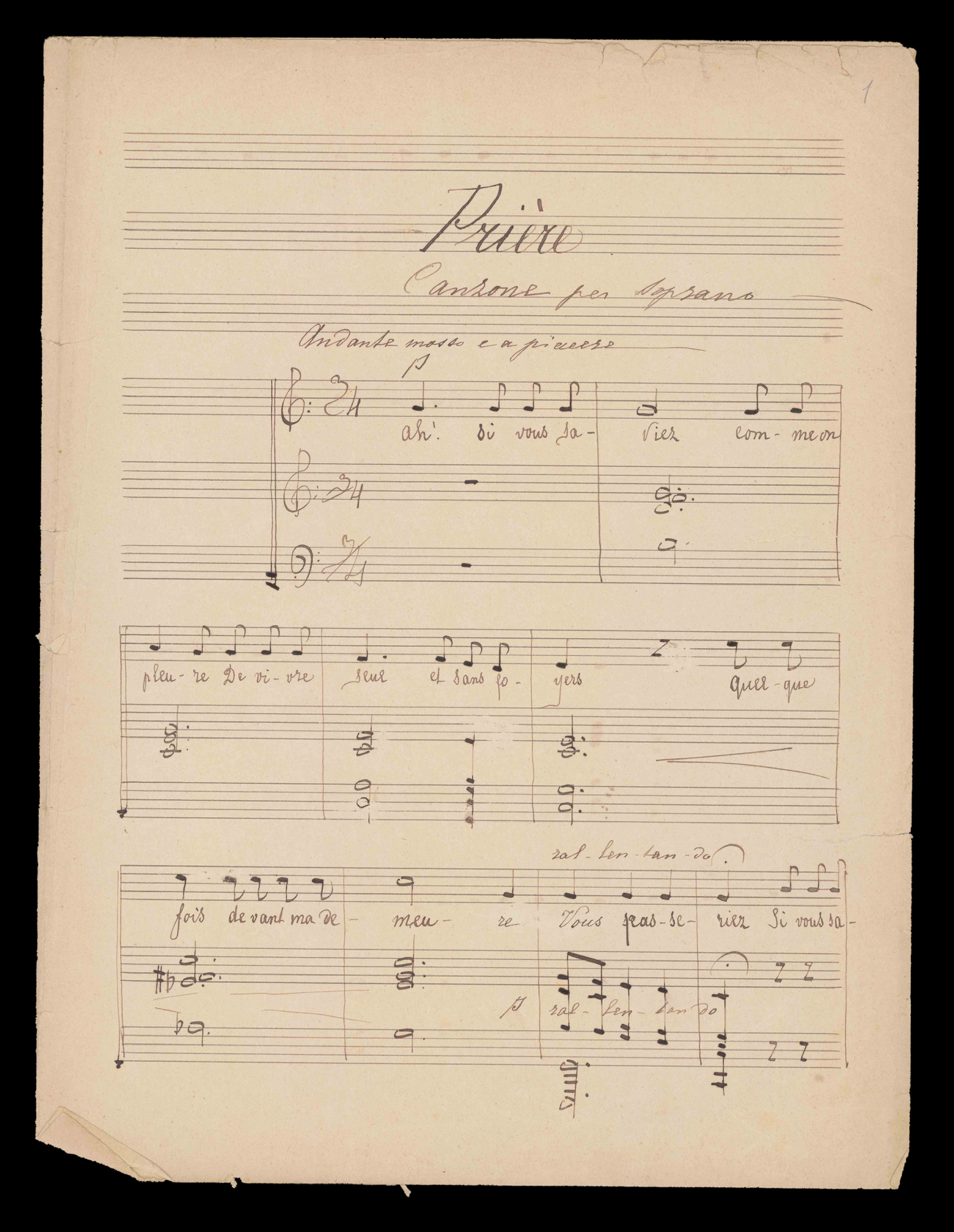 [2] c. ; 33 cm. Ricevuto in dono da Aldo Alberti Poja nel 1940. Manoscritto autografo. Nome dell'A. del testo da: Les vaines tendresses / Sully Prudhomme. Paris, Lemerre, 1875, pp. 5-6