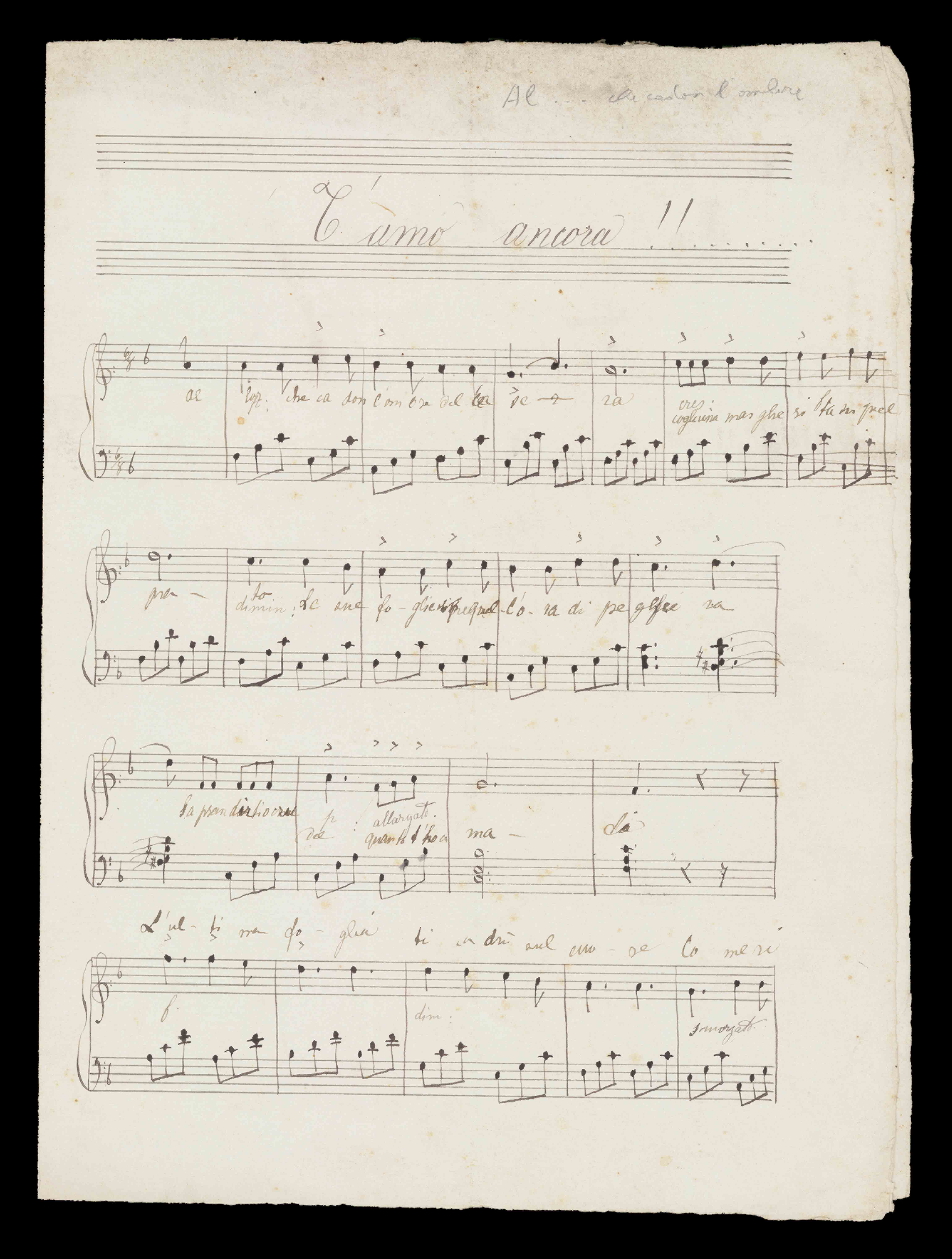 [2] c. ; 31 cm. Ricevuto in dono da Aldo Alberti Poja nel 1940. Manoscritto autografo. Nome dell'A. del testo da: T'amo ancora / melodia di F. Paolo Tosti; parole di L. M. Cognetti. Milano, Ricordi, 1878