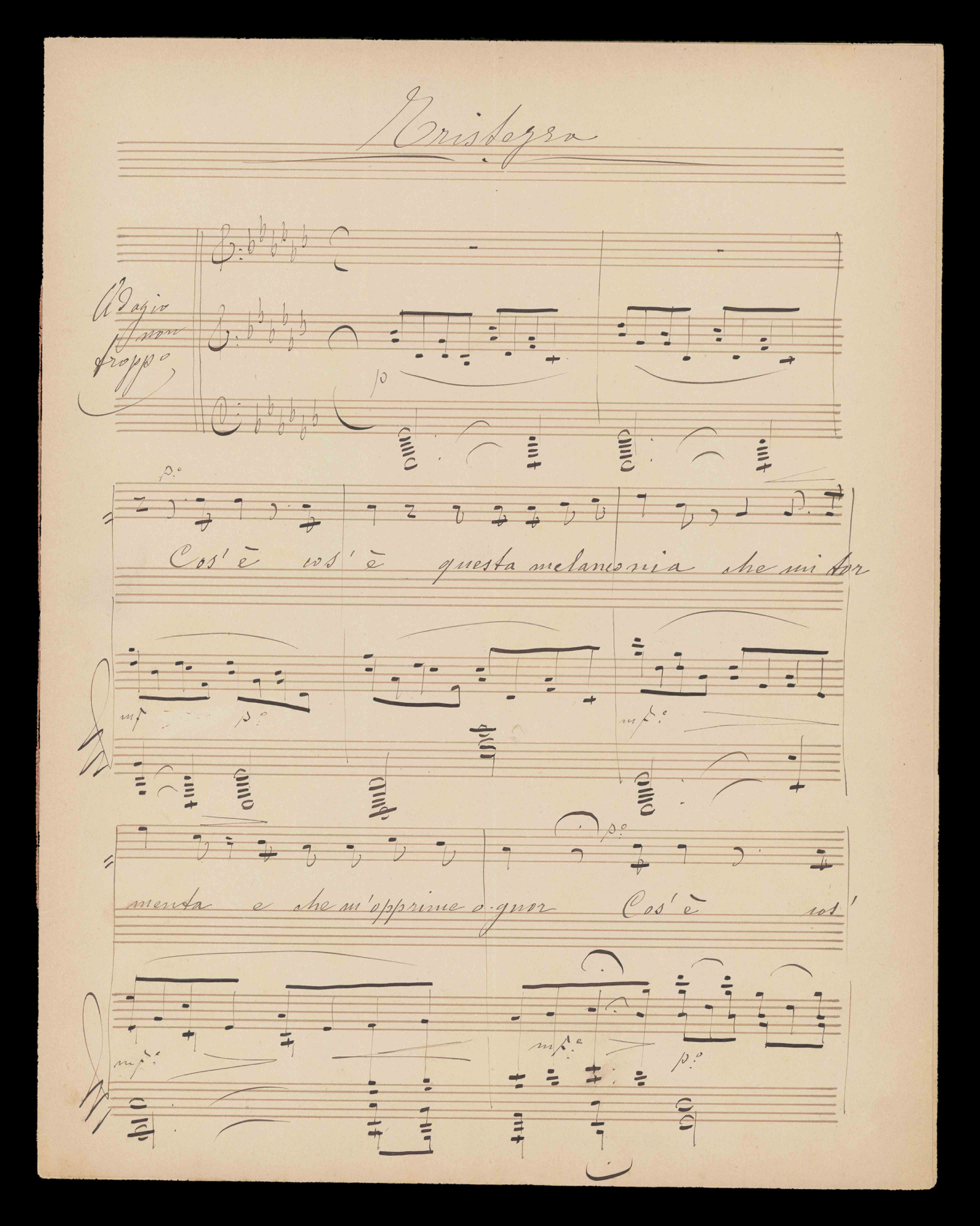 1 partitura ([3] c.) ; 33 cm + 1 parte ([2] c.). Ricevuto in dono da Aldo Alberti Poja nel 1940. Manoscritto autografo. Nome dell'A. del testo da: Toscanini visto da un critico / Andrea Della Corte. Torino, ILTE, 1958, p. 31