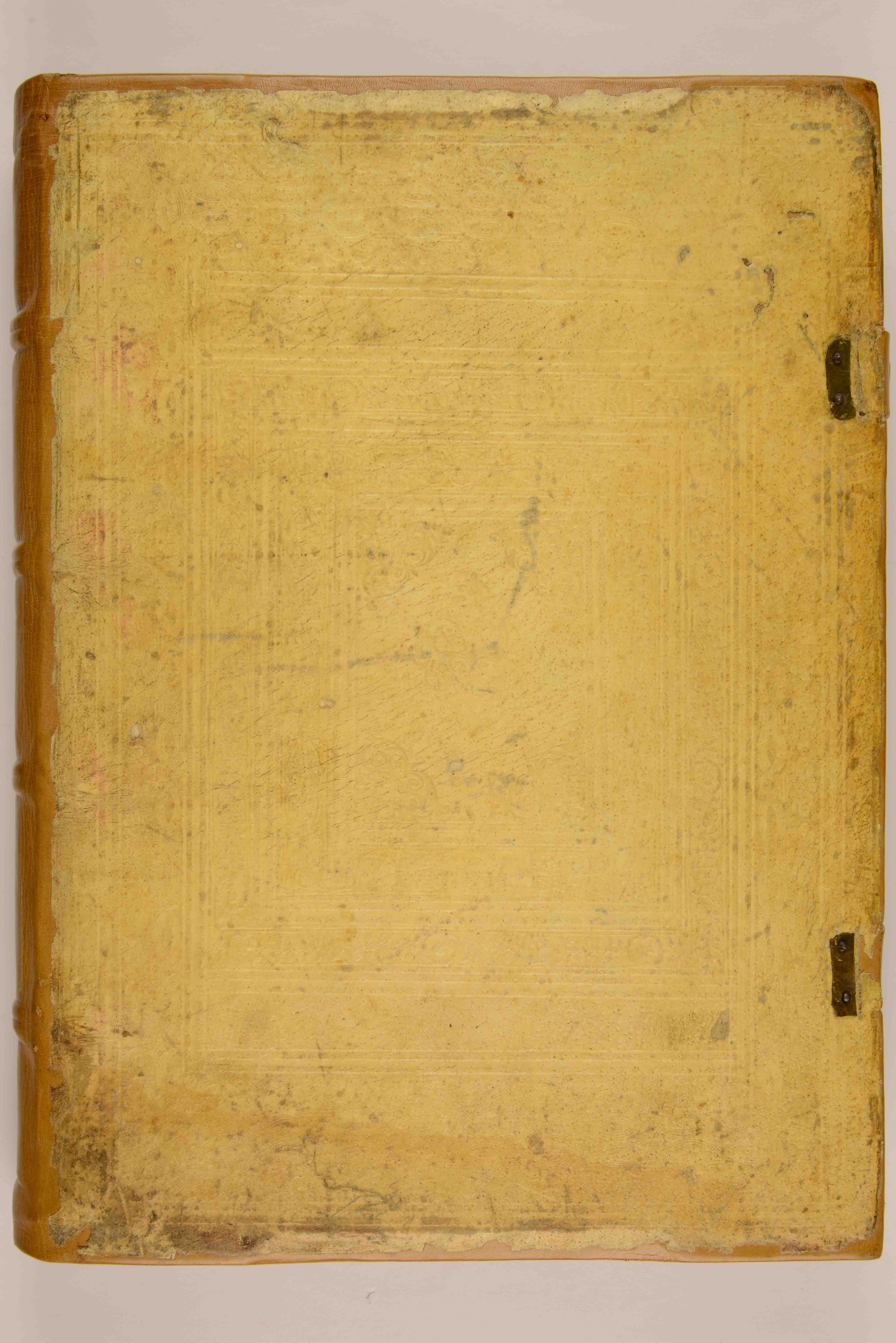 Membr.; ff. III, 62 (60), III'; numerazione coeva in cifre romane; inizio fascicolo lato carne; 12, 2-38, 46, 5-88, 92, 104; richiami; tracce di segnatura a registro; 300 × 220 = 23 [221] 56 × 24 / 5 [147] 5 / 39 (ff. 1r-57r); 15 [235] 50 × 21 / 5 [150] 6 / 38 (ff. 57v-59v); rr. 42 / ll. 7 – tetr. 7 (ff. 1r-57r; sette tetragrammi alternati con sette linee scritte); rr. 27 / ll. 26 (ff. 57v-59v); rigatura a colore. Una iniziale filigranata, iniziali semplici, iniziali cadeaux; titoli, numerazione e ritocchi in rosso; notazione musicale quadrata in nero su tetragramma rosso. Legatura di restauro con reimpiego delle assi, della coperta in pelle impressa a secco.