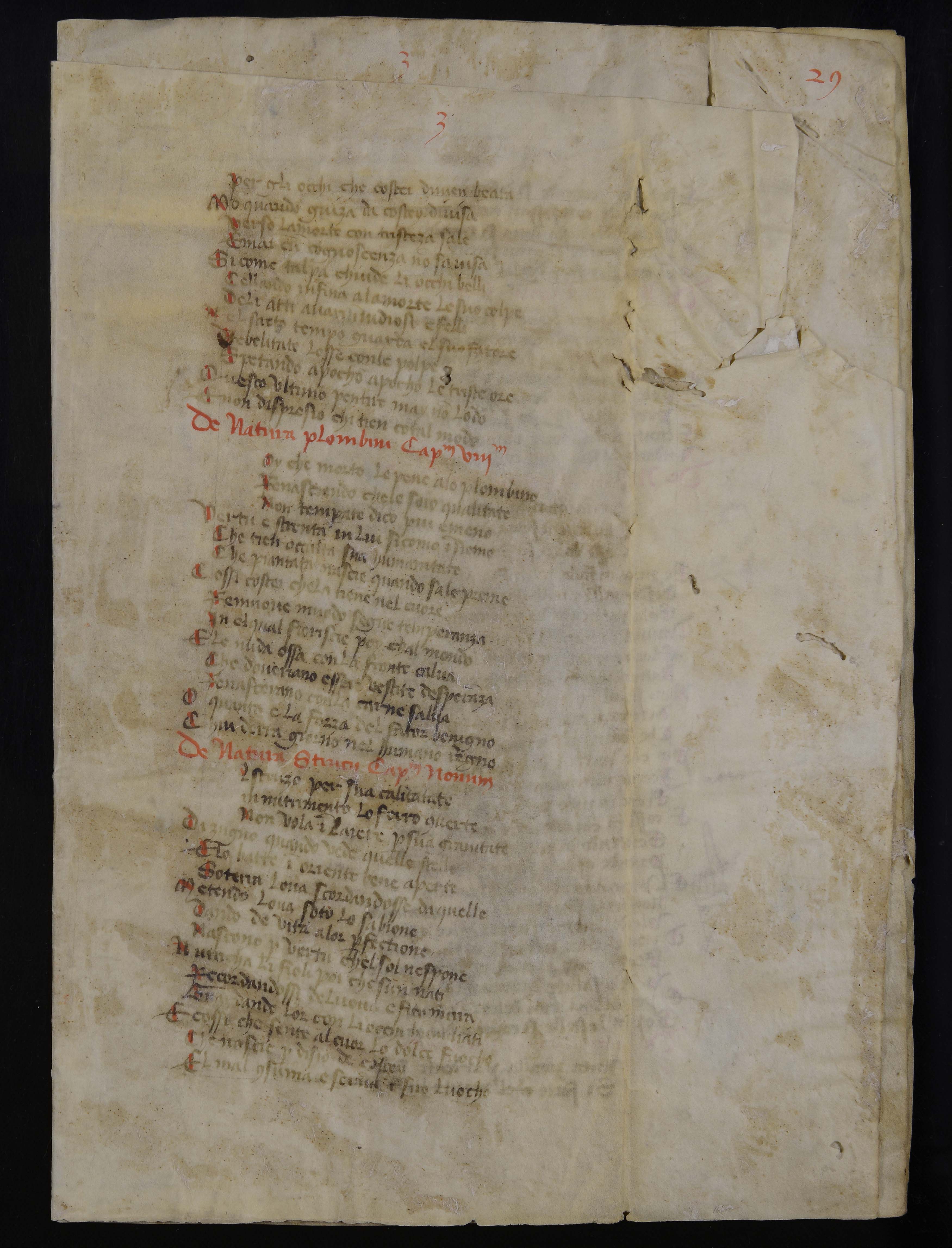Membranaceo; ff. 4. Frammento in volgare de L'Acerba (lib. III, capp. 7-40); titoli, antica cartulazione manoscritta (nell'angolo superiore destro) e ritocchi delle maiuscole in rosso; segni di attenzione (maniculae).