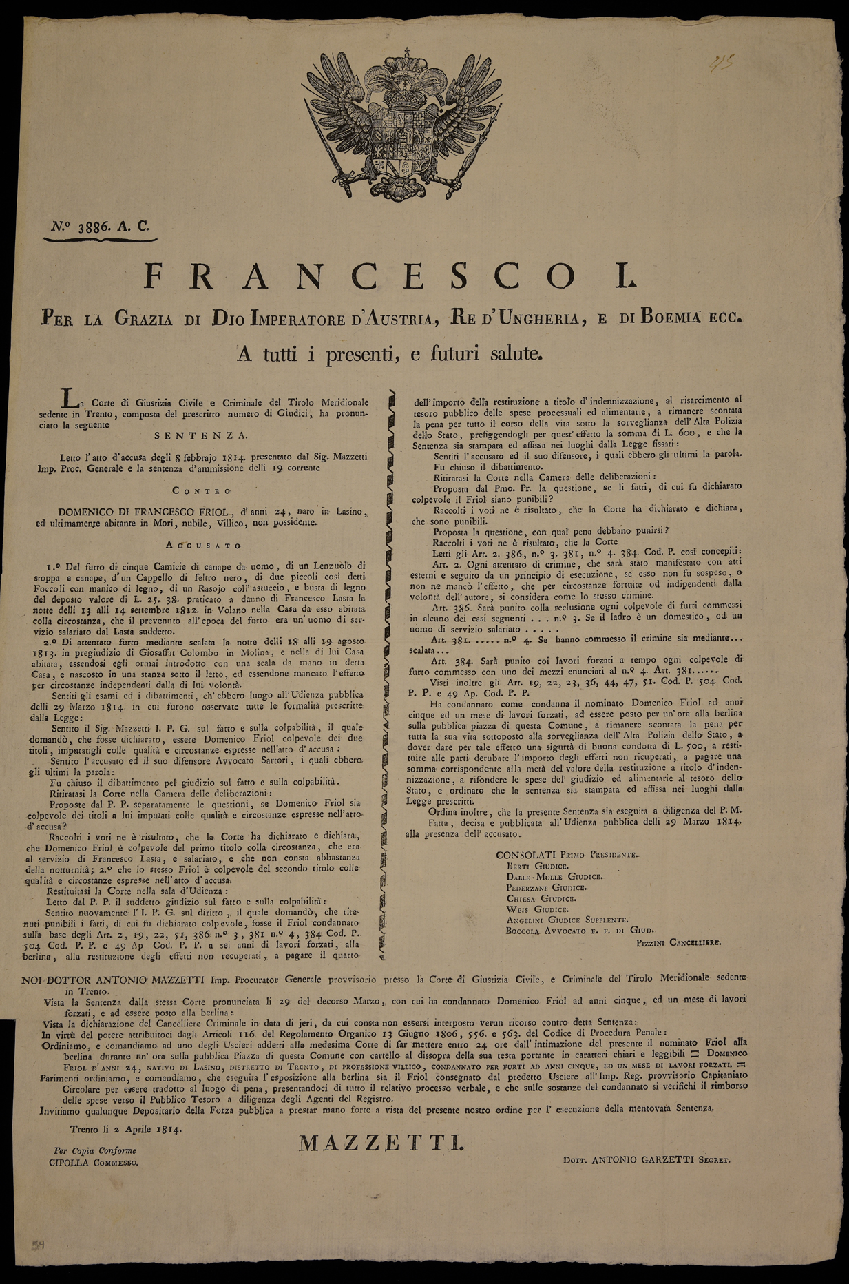 La Corte di Giustizia civile e criminale del Tirolo Meridionale sedente in Trento composta del prescritto numero di giudici ha pronunciato la seguente sentenza ...