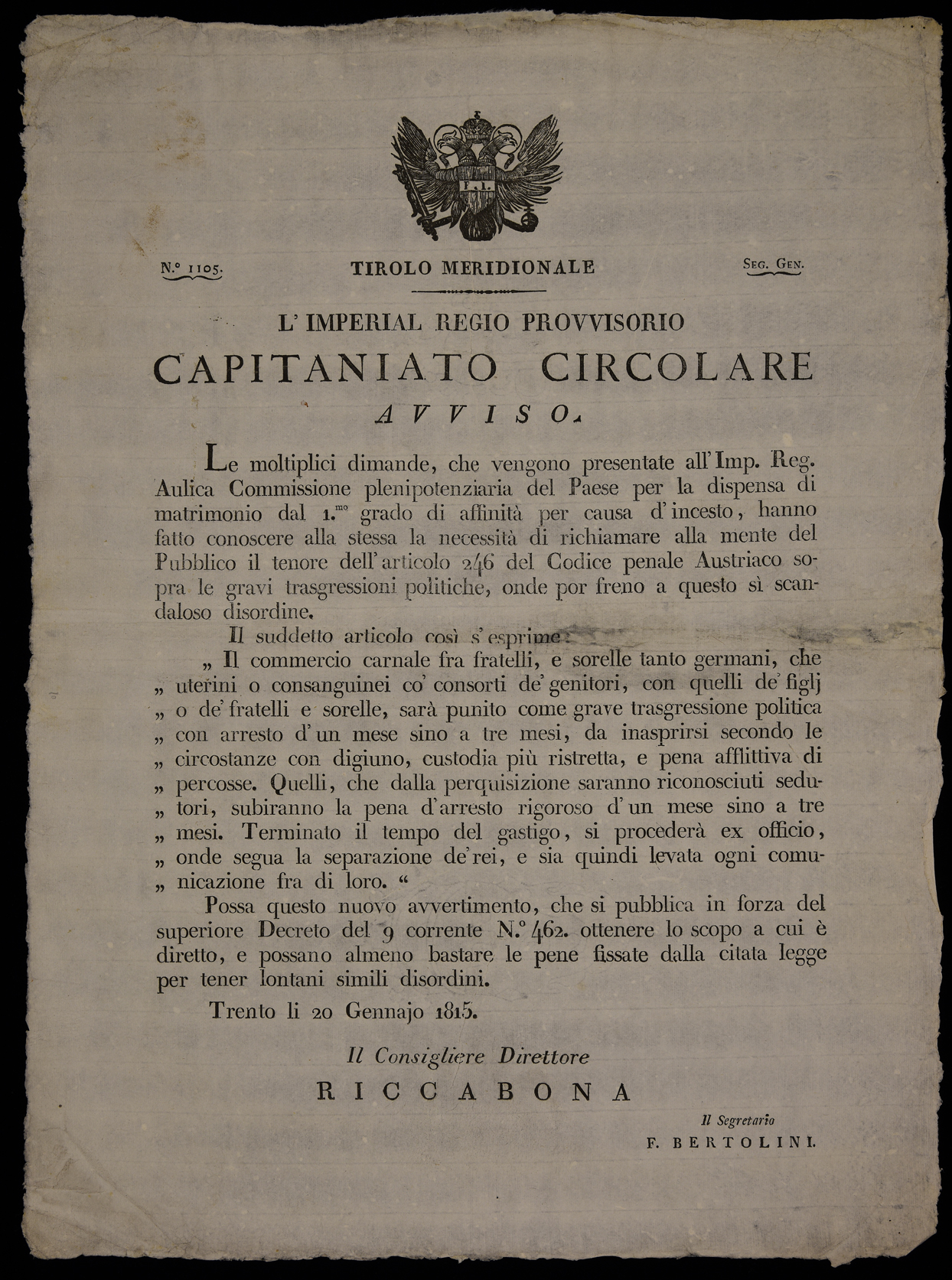 L'Imperial Regio Provvisorio Capitaniato circolare. Avviso