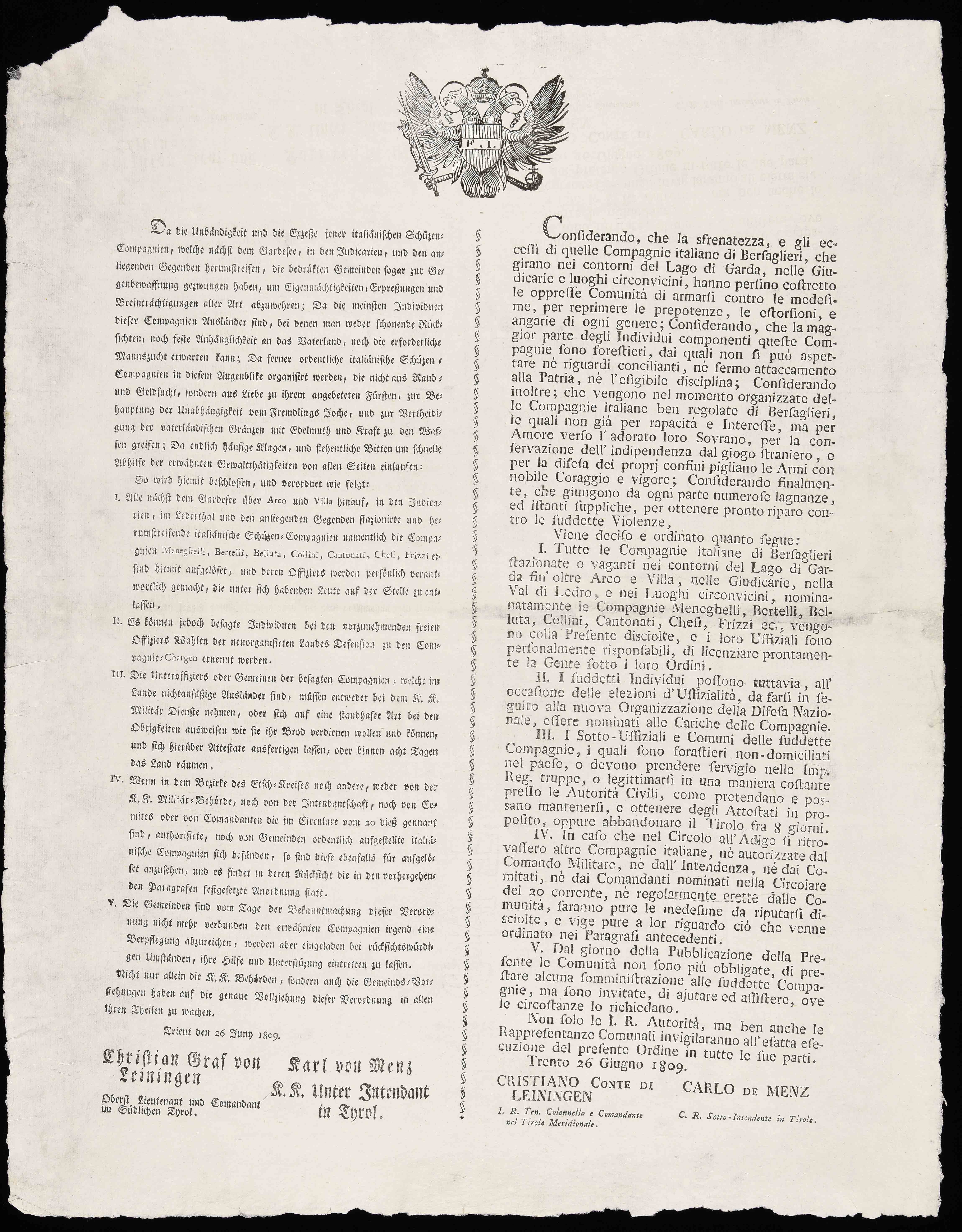 Stemma di Francesco I imperatore. Proclama emanato il 26 giugno 1809 e sottoscritto da Christian von Leiningen (tenente colonnello e comandante nel Tirolo meridionale), Karl von Menz (sottintendente in Tirolo) sullo scioglimento delle compagne italiane di Bersaglieri.