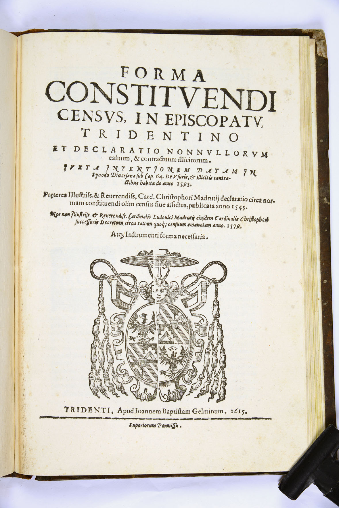 | Forma constituendi census, in episcopatu Tridentino et declaratio nonnullorum casuum, & contractuum illicitorum. Juxta intentionem datam in Synodo dioecesana sub cap. 64 de usuris, & illicitis contractibus habita de anno 1593. Preterea illustriss. & reverendiss. card. Christophori Madrutii declaratio circa normam constituendi olim census sive affictus, publicata anno 1545. Nec non illustriss. & reverendiss. cardinalis Ludovici Madrutii eiusdem cardinalis Christophori successoris decretum circa taxam quoque censuum emanatam anno 1579. Atque instrumenti forma necessaria |