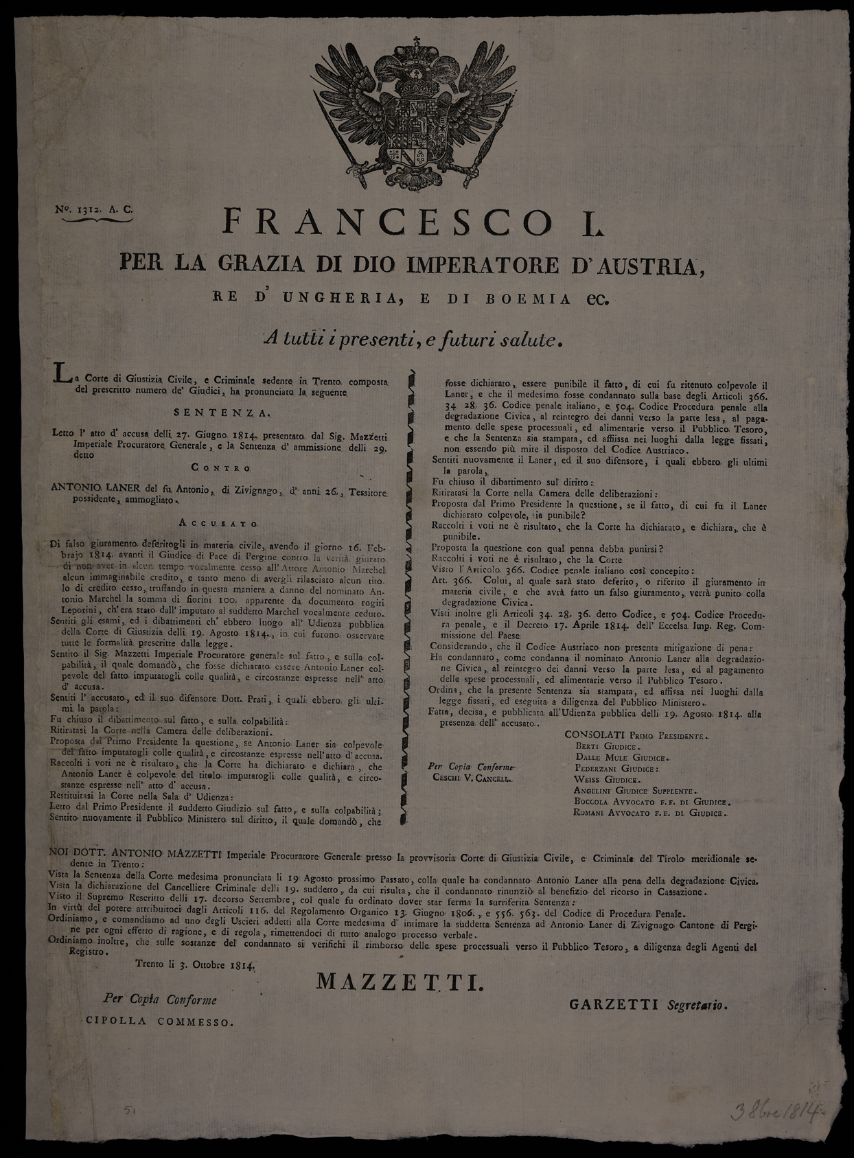 La Corte di Giustizia civile e criminale sedente in Trento composta del prescritto numero de' giudici ha pronunciato la seguente sentenza ...