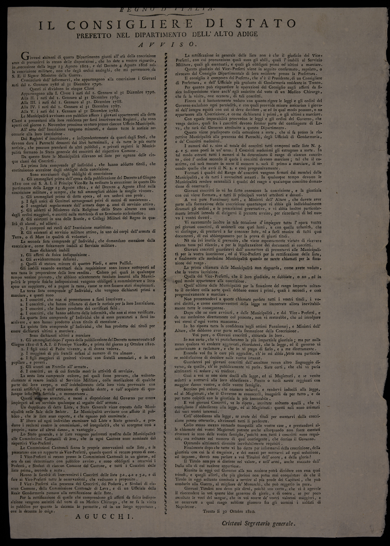 | Il consigliere di Stato, prefetto nel Dipartimento dell'Alto Adige. Avviso |