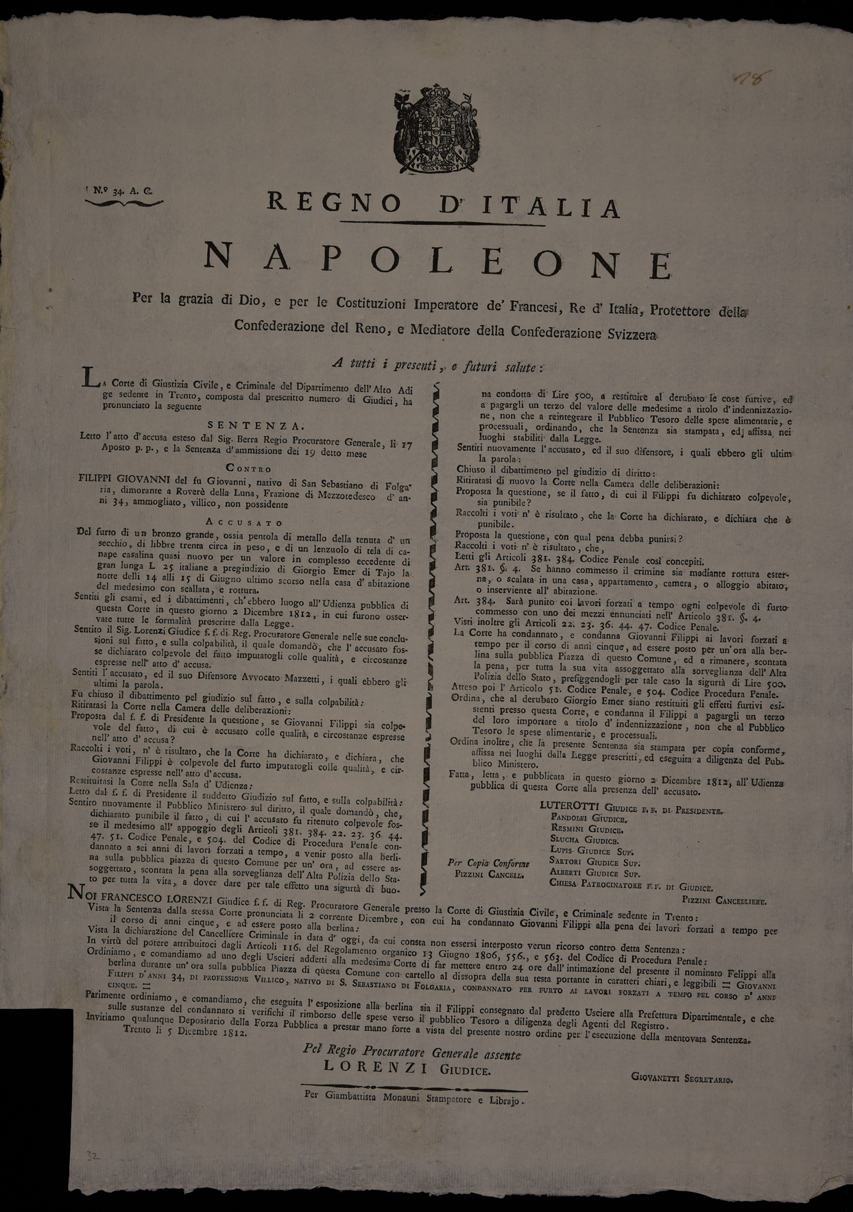 La Corte di Giustizia civile e criminale del Dipartimento dell'Alto Adige sedente in Trento composta dal prescritto numero di giudici ha pronunciato la seguente sentenza ...