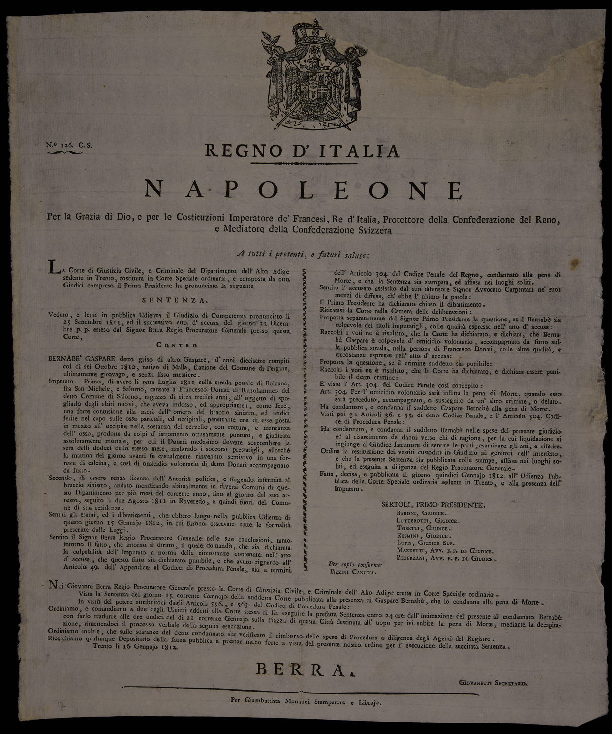 La Corte di Giustizia civile e criminale del Dipartimento dell'Alto Adige sedente in Trento costituita in Corte speciale ordinaria e composta da otto giudici compreso il primo presidente ha pronunciato la seguente sentenza ...