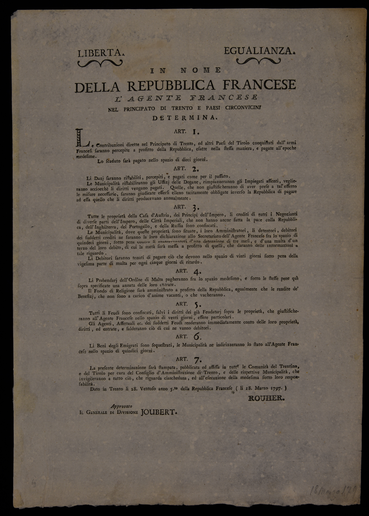 1 manifesto. Proclama sull'amministrazione del Trentino e Tirolo sotto la repubblica francese emanato il 18 marzo 1797 dal Consiglio di Trento, stampa attribuibile alla tipografia Monauni di Trento in base al raffronto di caratteri e fregi